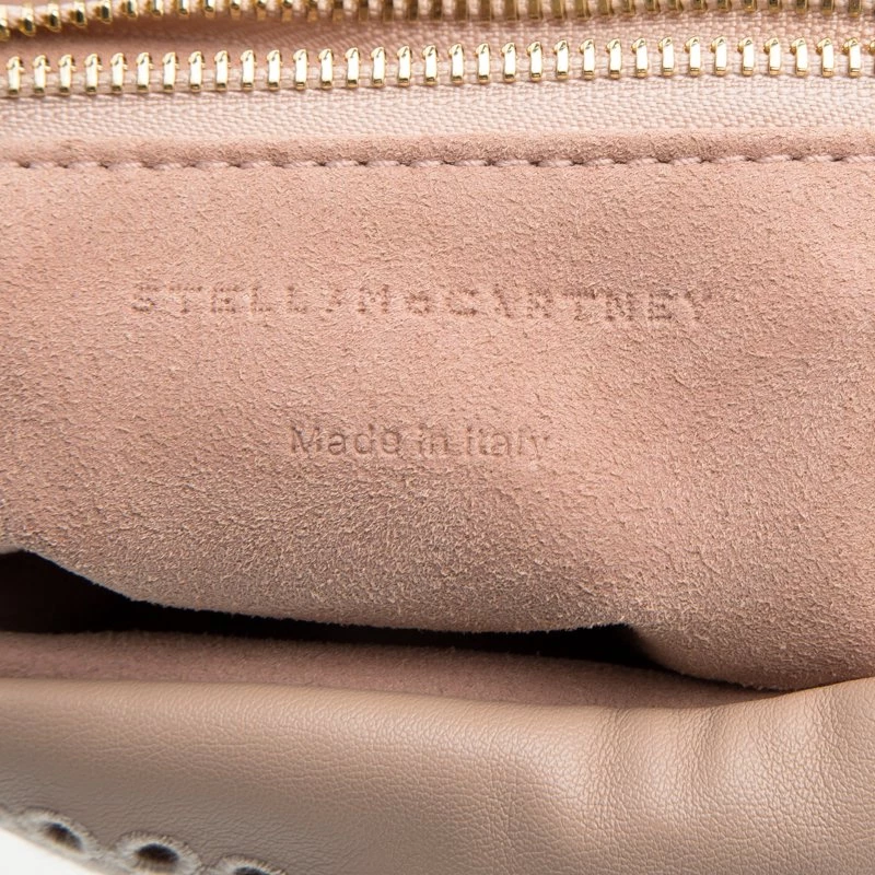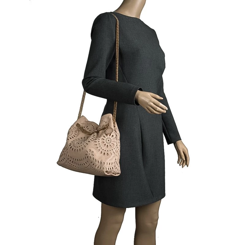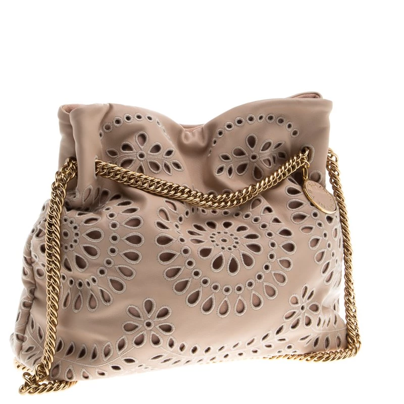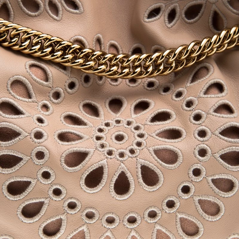 The chic bucket bag from Stella McCartney in beige is crafted in faux leather. Accentuated with a gold chain shoulder strap the Eyelet Noma bag is a fashionista’s choice! Featuring perforated floral cut-outs all over, the bag opens into a faux suede interior with dual compartments divided by a zip compartment.