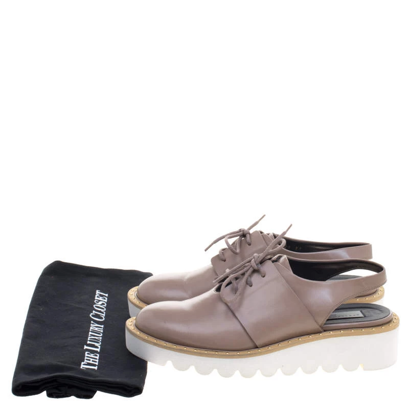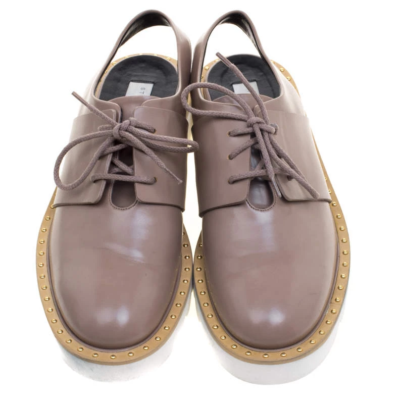 Oxfords are always in vogue and this slingback pair from Stella McCartney proves that with its fabulous design and craftesmanship. The beige oxfords are crafted from faux leather and feature round toes with a lace-up fastening at the front and a gold tone stud detailing on the leather trim. With leather lined insoles and a tough base for comfort, this Italian pair is sure to grab you attention wherever you go.