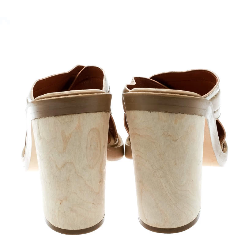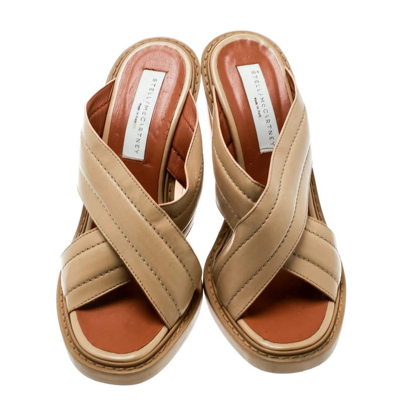 Go for a fresh and girly look while wearing these Stella McCartney slides. Made from beige faux leather, their feature criss-cross straps on the vamps. Lined with faux leather, their insoles are coupled with 11 cm marbled veneer block curved heels.
