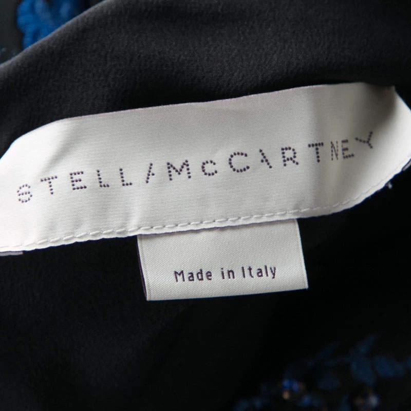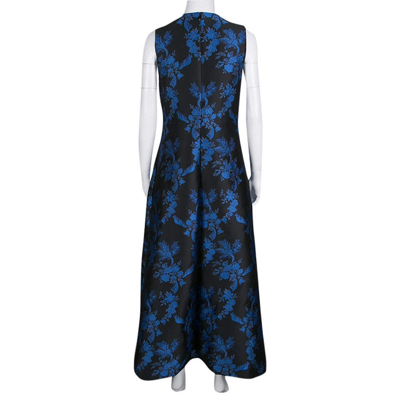 Subtle femininity and sharp tailoring define the designs from Stella McCartney. This blue and black jacquard Angelica gown is an elegant piece that you can flaunt on your next black-tie event. Graced with an appropriate length, this sleeveless dress is accented with floral embellishments that add a luxe touch to this sophisticated yet chic outfit. Team it with Mary Jane pumps for a feminine look.