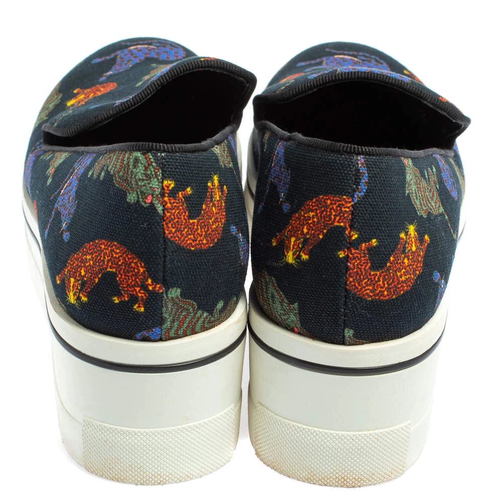 Stella McCartney’s love for animals is vividly displayed on these sneakers. Crafted from canvas, they feature feline animals printed atop a black backdrop. These sneakers are elevated on chunky platforms.