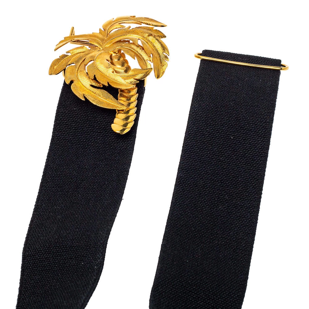 This belt from Stella McCartney will be your new favorite statement accessory. It has a minimalist design rendered in black canvas and accented with a palm tree buckle in gold-tone metal. This belt will complement your versatile fashion choices effortlessly.