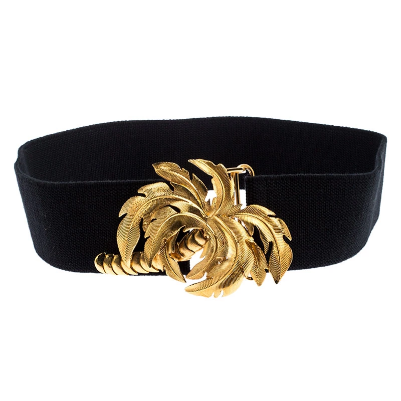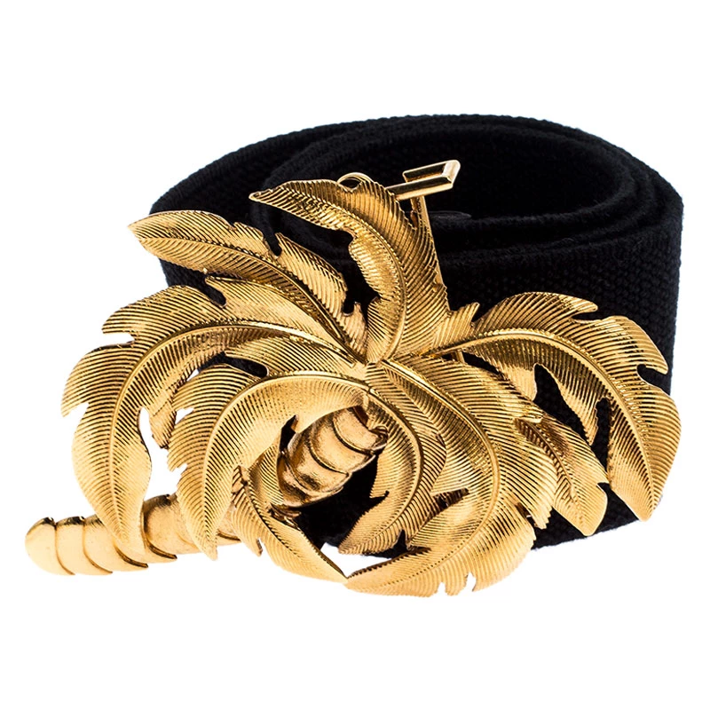 This belt from Stella McCartney will be your new favorite statement accessory. It has a minimalist design rendered in black canvas and accented with a palm tree buckle in gold-tone metal. This belt will complement your versatile fashion choices effortlessly.