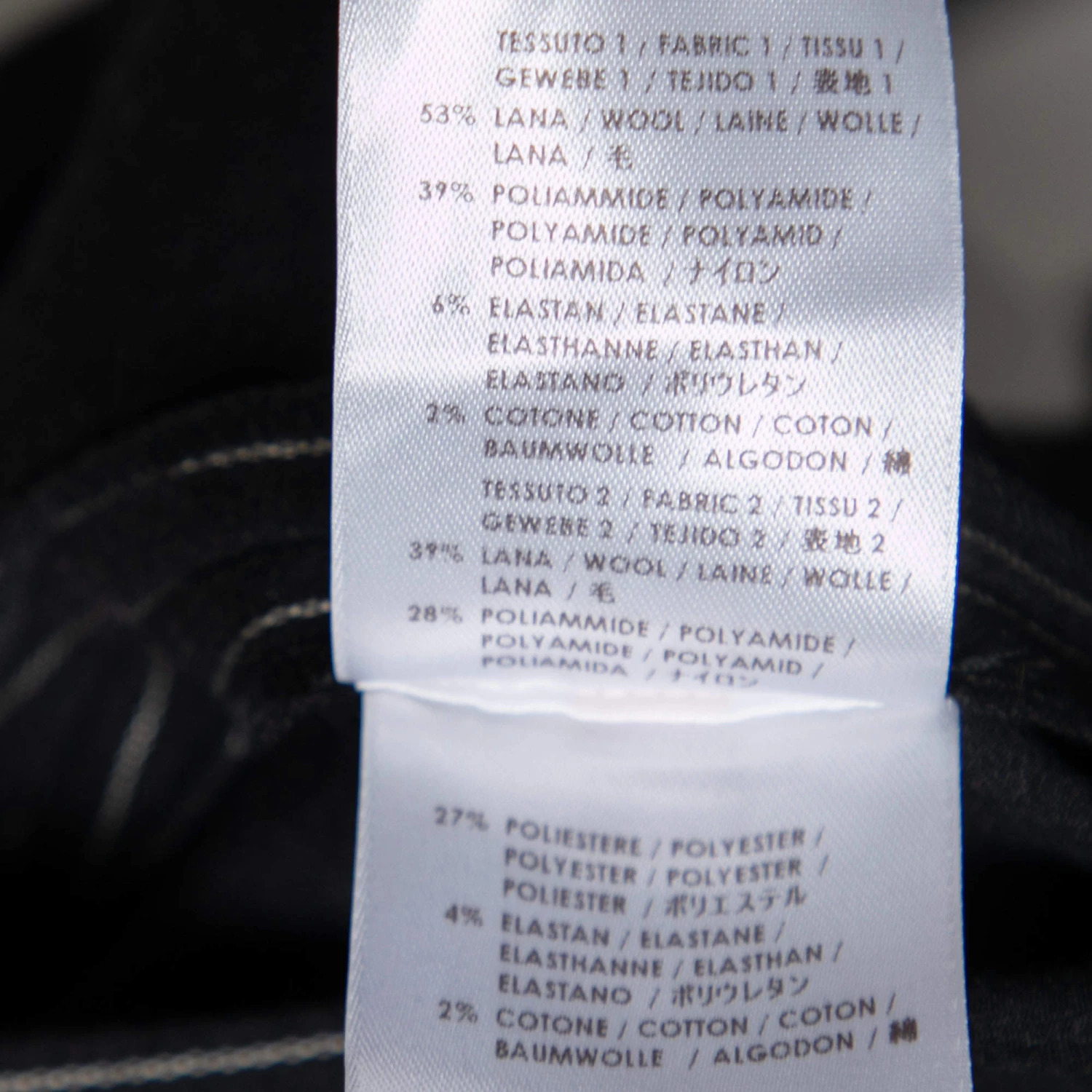 - Composition: Fabric 1: 53% Wool, 39% Polyamide, 6% Elastane, 2% Cotton; Fabric 2: 39% Wool, 28% Polyamide, 27% Polyester, 4% Elastane, 2% Cotton