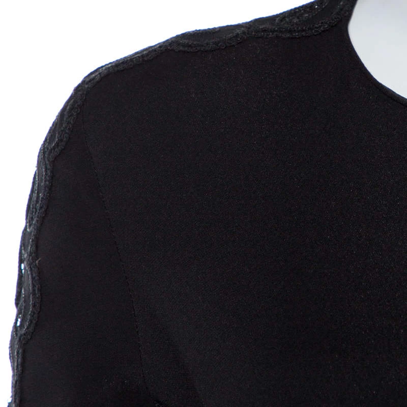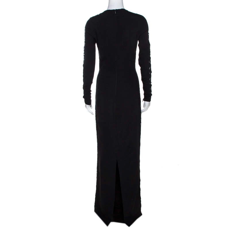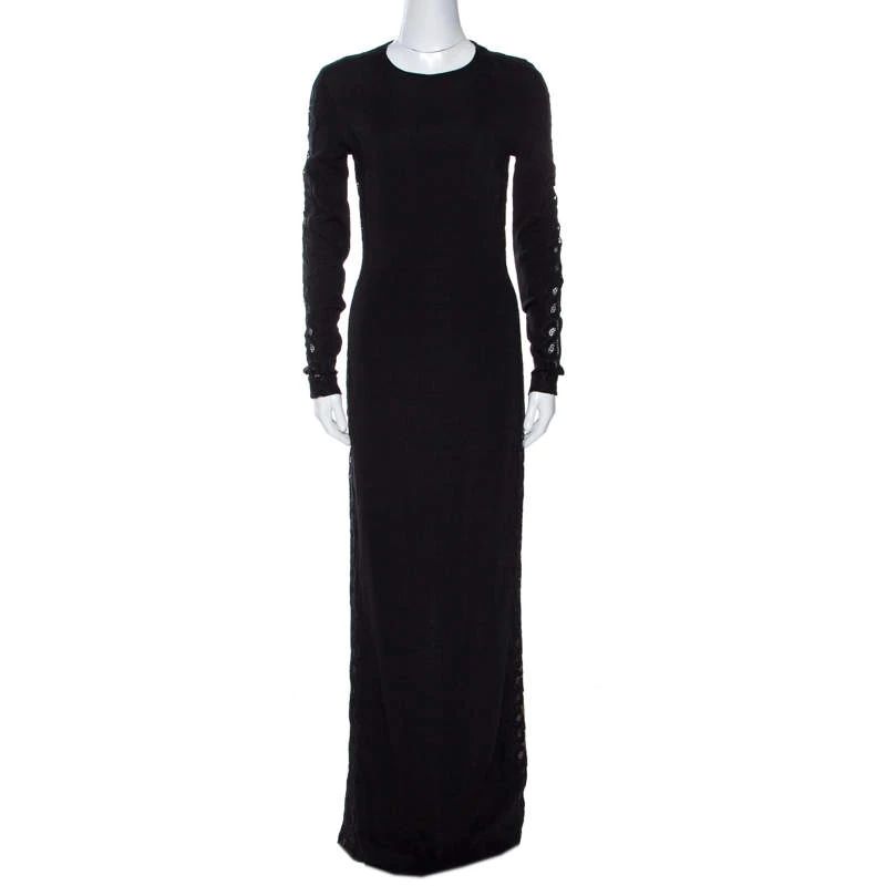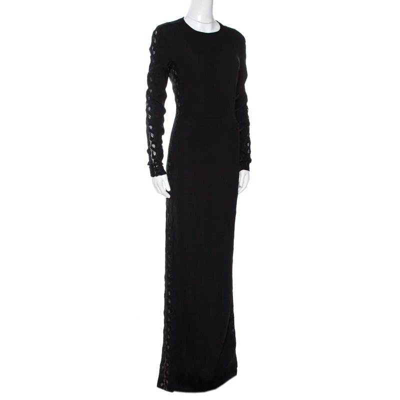 Perfect for formal occasions and special evenings, this stylish and sophisticated maxi dress comes from the house of Stella McCartney. Crafted from quality materials, it comes with a 100% silk lining and carries a black hue. It is styled with long sleeves, a round neck and a hemline that grazes the floor. It is beautified with lace trims on the sleeves and sides that add glamour and femininity.