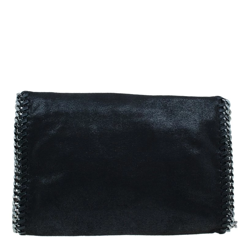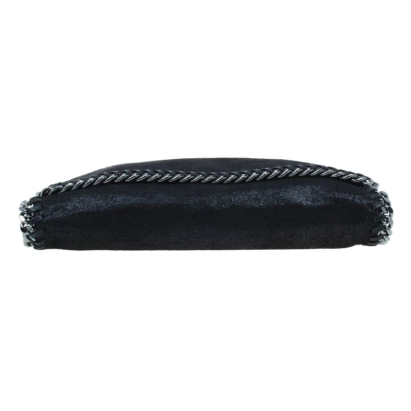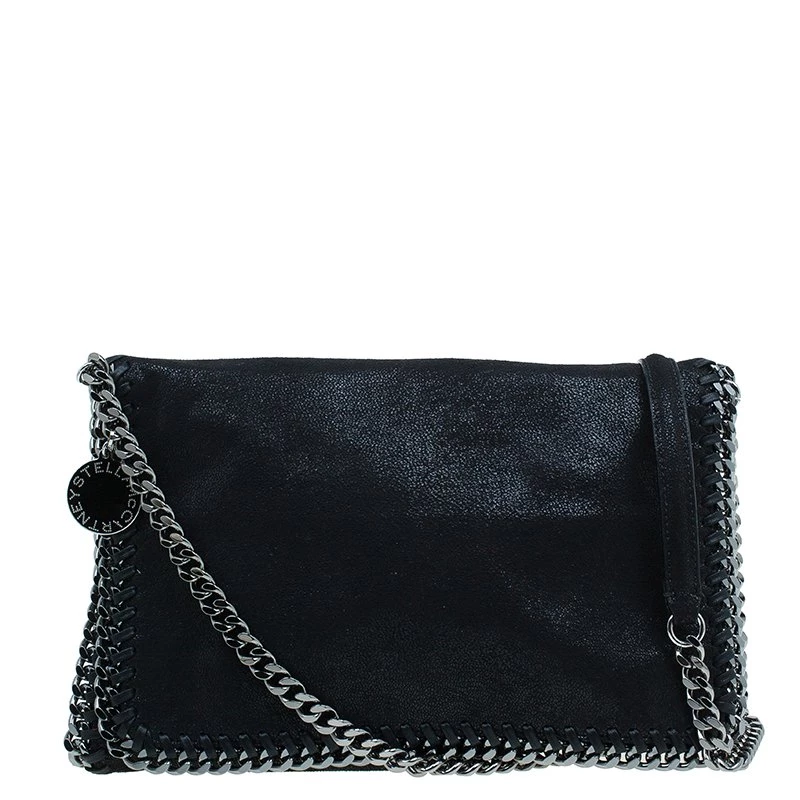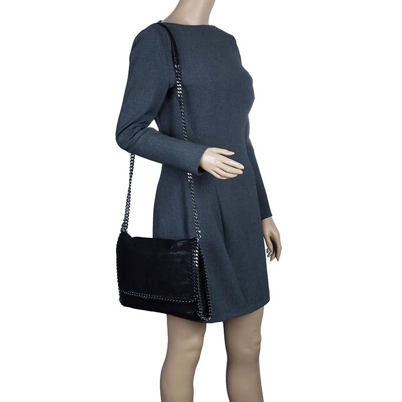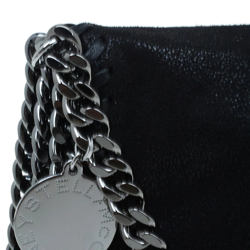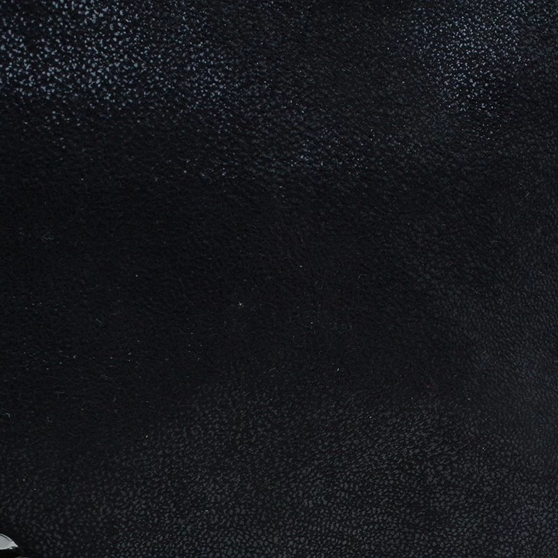 Part of the Falabella collection, this Stella McCartney bag is a black beauty. Made from polyester, its leather-like exterior has a suede feel to it, giving it a smooth and luxurious appearance. Its stitched trim attached the chain link to its side, creating a rocker chic look. Its versatility comes from the dark silver hardware that forms the top handles and shoulder strap. The interior has a magnetic snap closure and is lined with monogrammed textile and features one zip pocket.