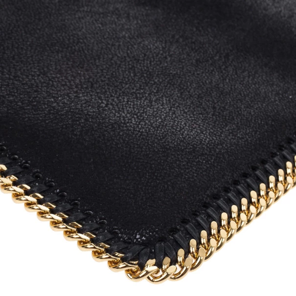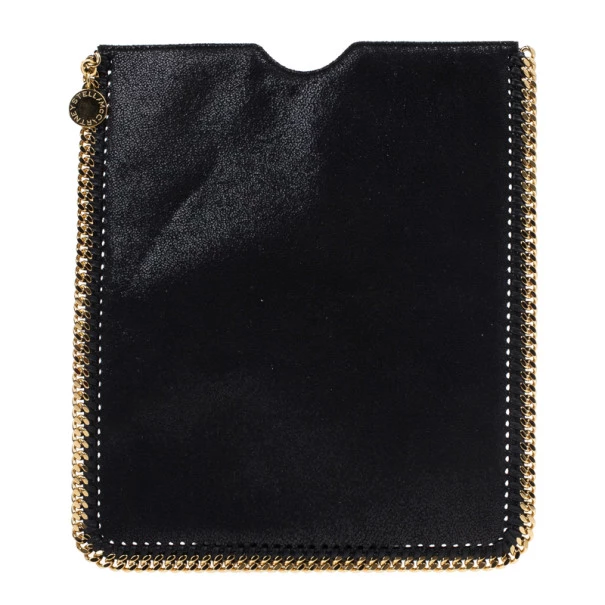 Part of the signature Falabella collection, this Stella McCartney iPad case will protect your tablet and keep it handy. Made from faux leather, its smooth suede-like exterior and black color are coupled with gold-tone chain stitched to the sides of the case. It is coupled with a Stella McCartney metal logo disc charm at the top.Original Retail Price: US $400