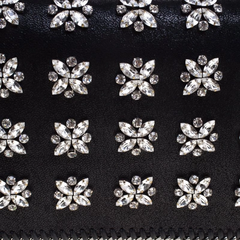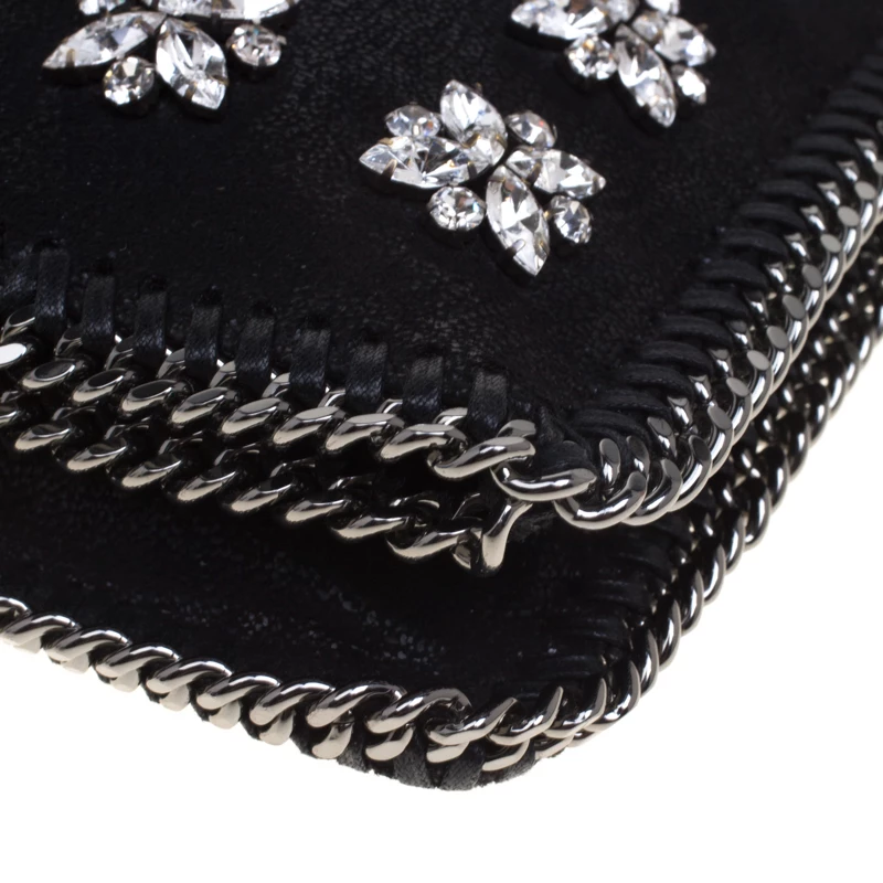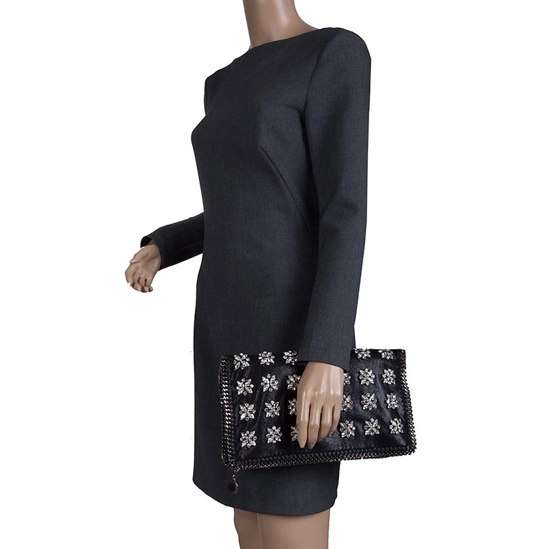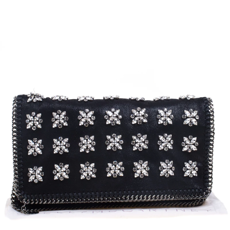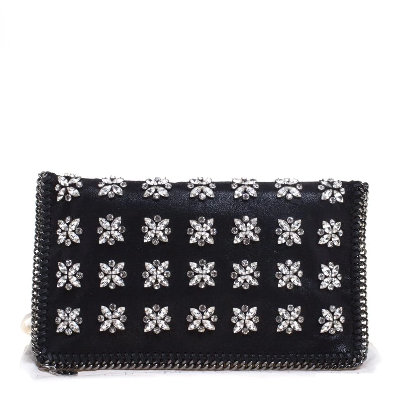 Stella McCartney is known for her classy designs and this chic foldover clutch perfectly embodies this trait. Crafted from faux leather with a fabric interior, this beauty has pretty crystal embellishments on the front and silver-tone chain details at its contours. It also features magnetic snap closure and a logo-engraved charm. This bag can be carried with formal dresses or party wear.
