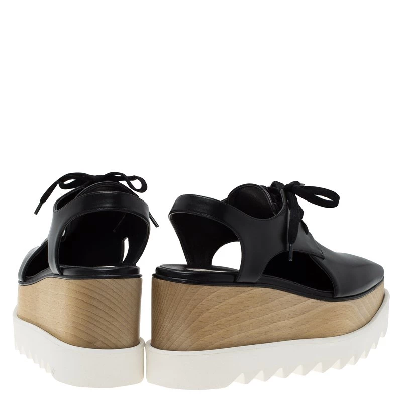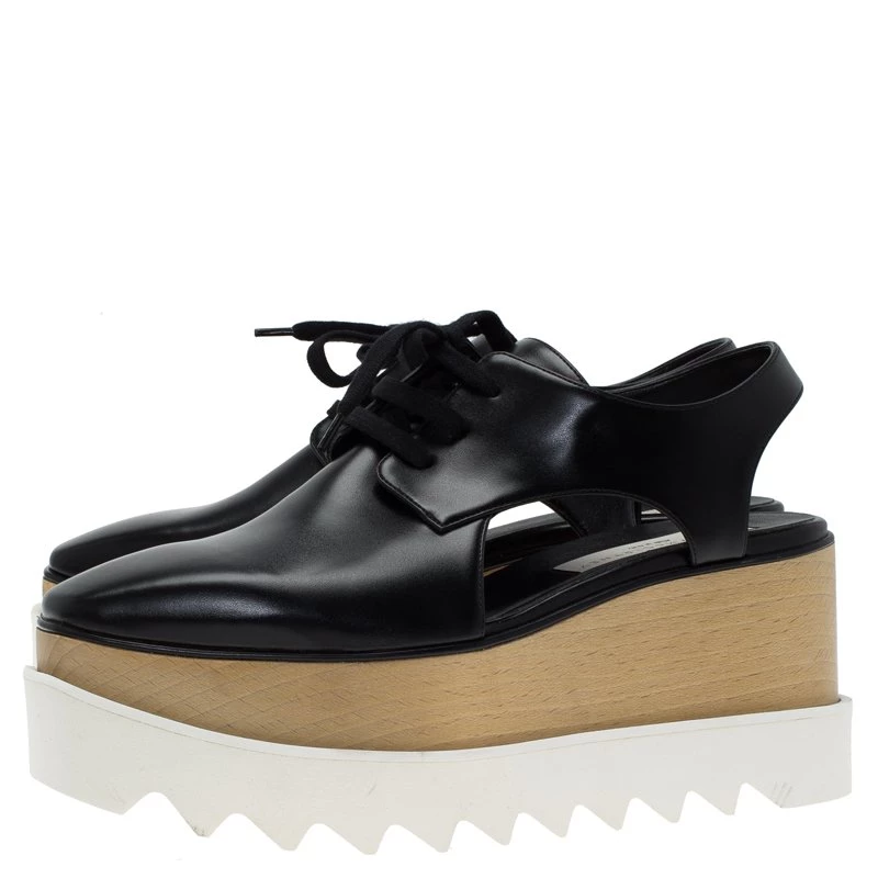 the Stella McCartney Derby is a perfect partner for weekend ensembles. Created with reference to the classic oxford-style, this pair is designed with stacked wooden platform sole and finished with the signature brogue platform. Styled in smooth black faux leather, the front lace tie-ups and cut out detailing makes this a stand-out piece.