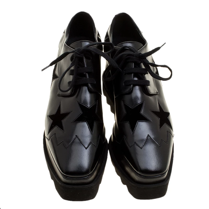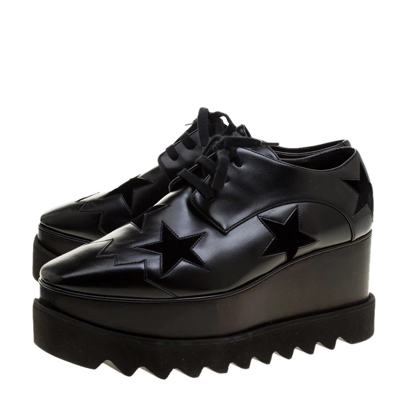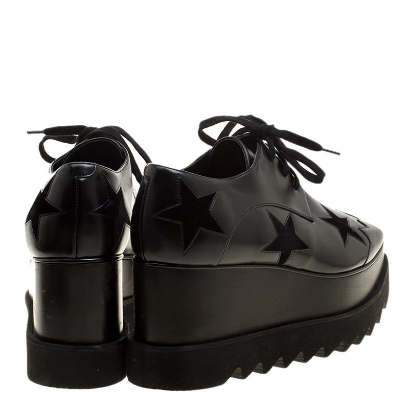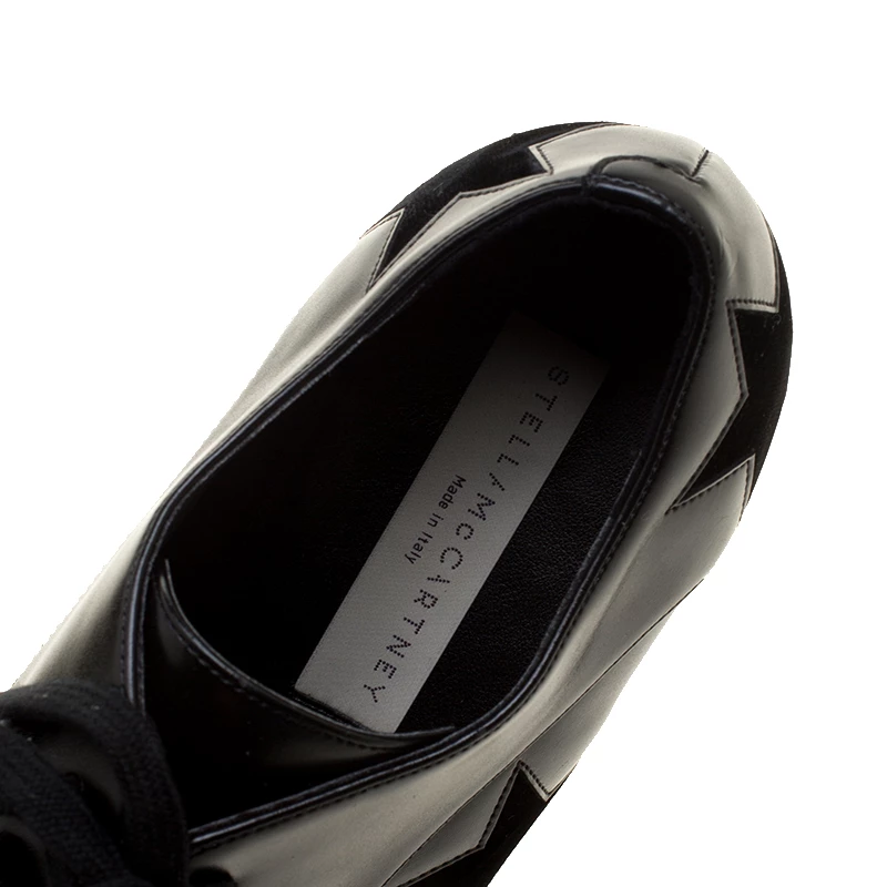 Jazz up your casual looks or add an edgy glam to your party outfits wearing these stunning Stella McCartney Elyse Star Derby shoes. Crafted in black faux leather and accented with black suede star shaped patches, these shoes feature thick black platforms which keep your comfortable while you giving the height.