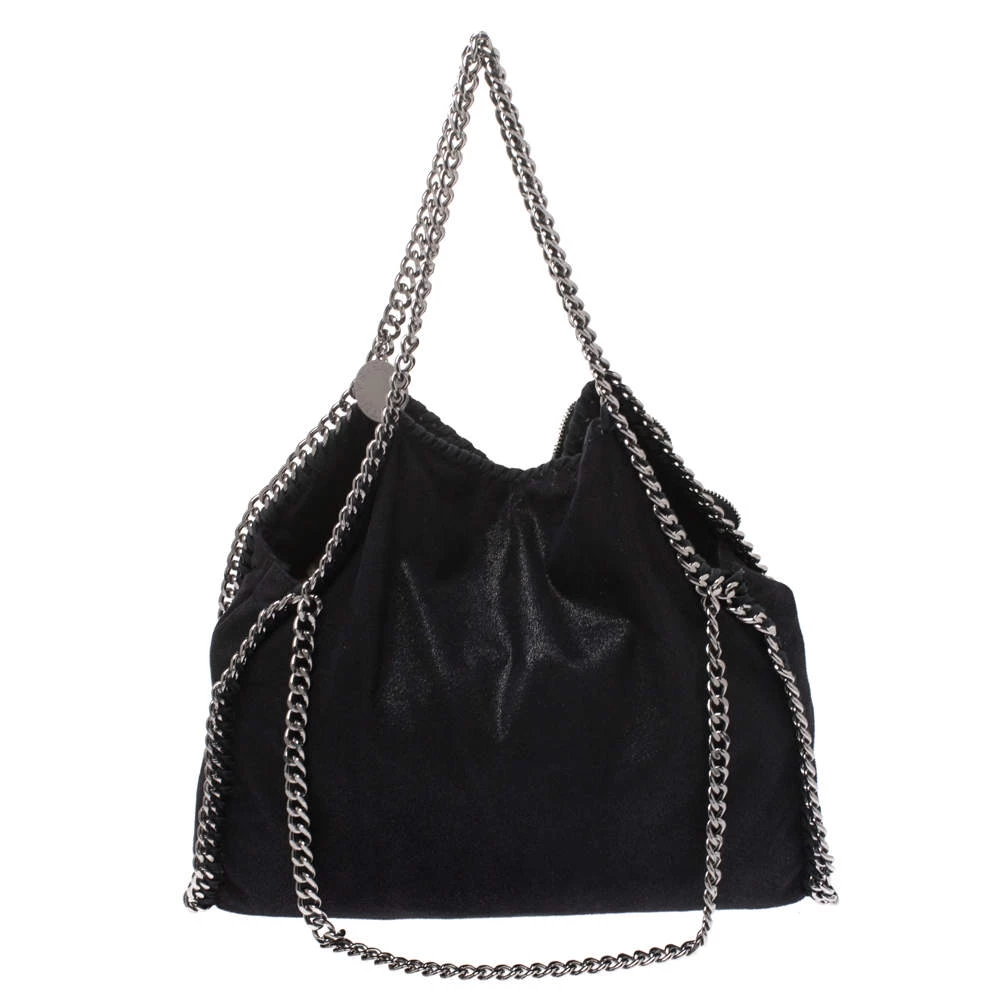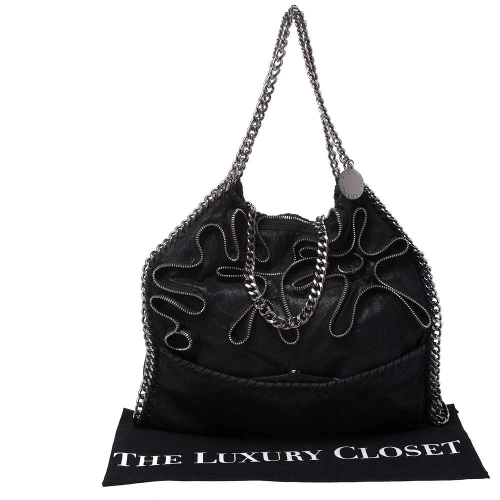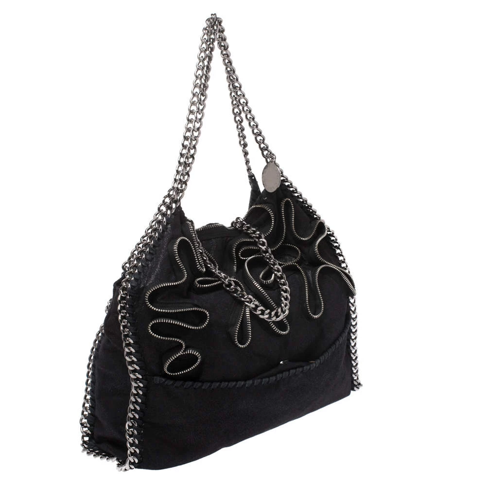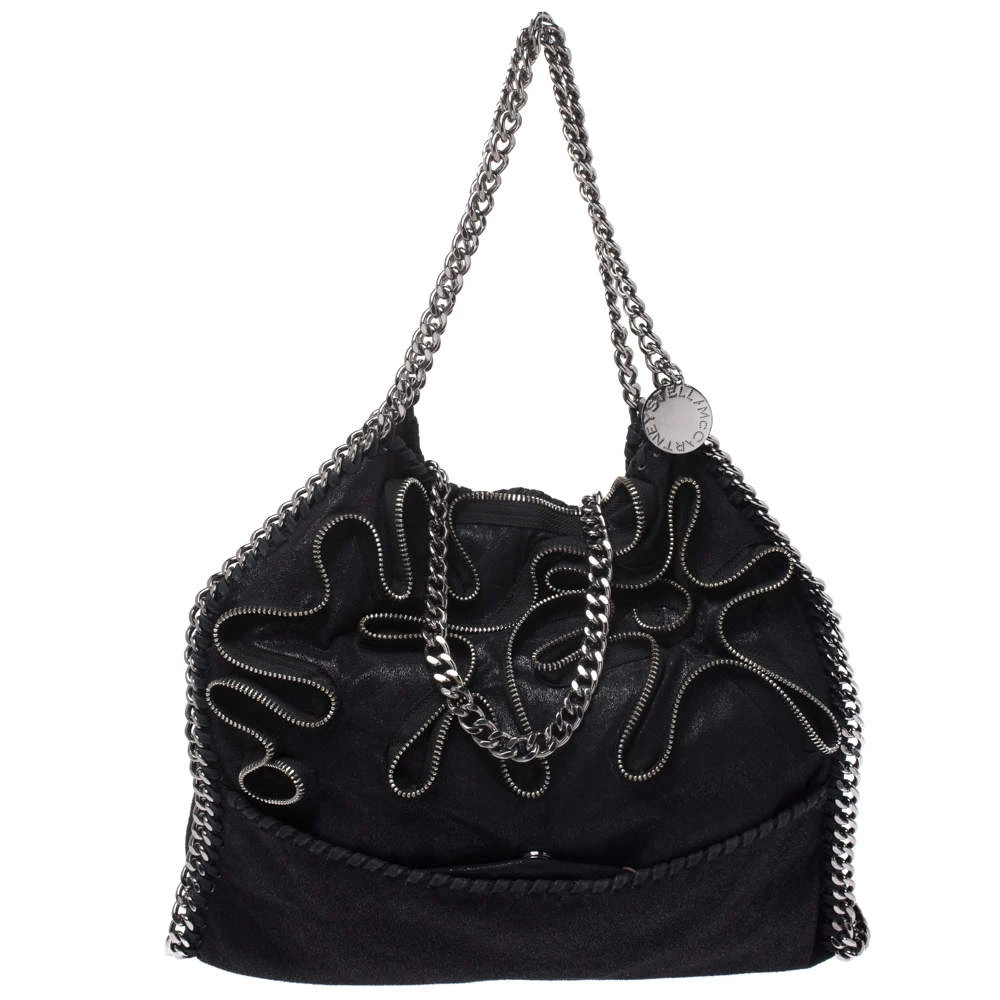 This Falabella tote by Stella McCartney has a unique twist with its zipper design detailing on the front. Crafted in quality black faux leather, the whipstitched chain trim in silver-tone looks edgy. The trim extends to form the chain strap and double handles which add to its overall look.