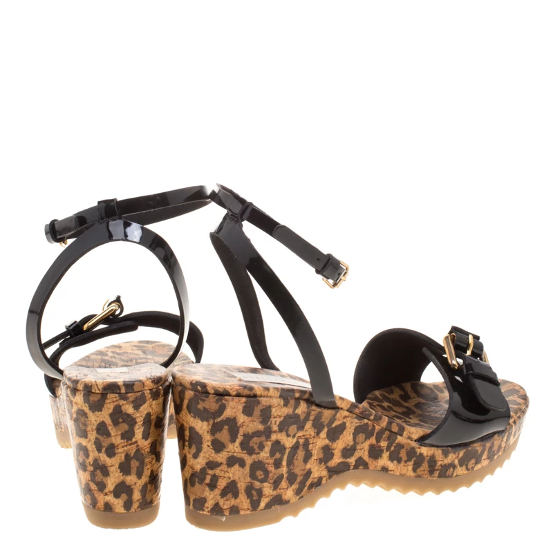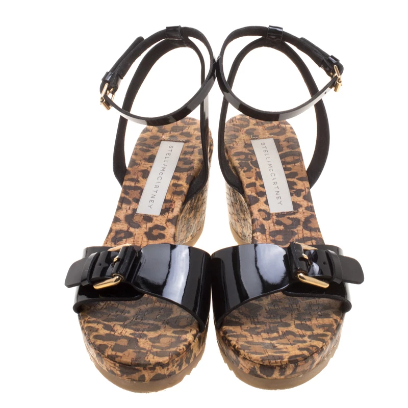 Stella McCartney is known for her chic designs and this pair of Linda wedges perfectly embodies this trait. Crafted from black faux leather, these cork wedge sandals feature a beautiful leopard print exterior. Styled with open toes, this pair comes with buckle ankle straps and gold tone buckle detailing on the vamps.
