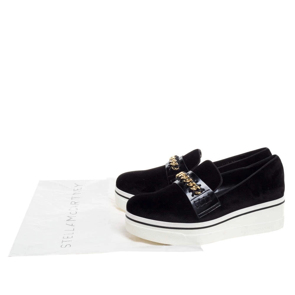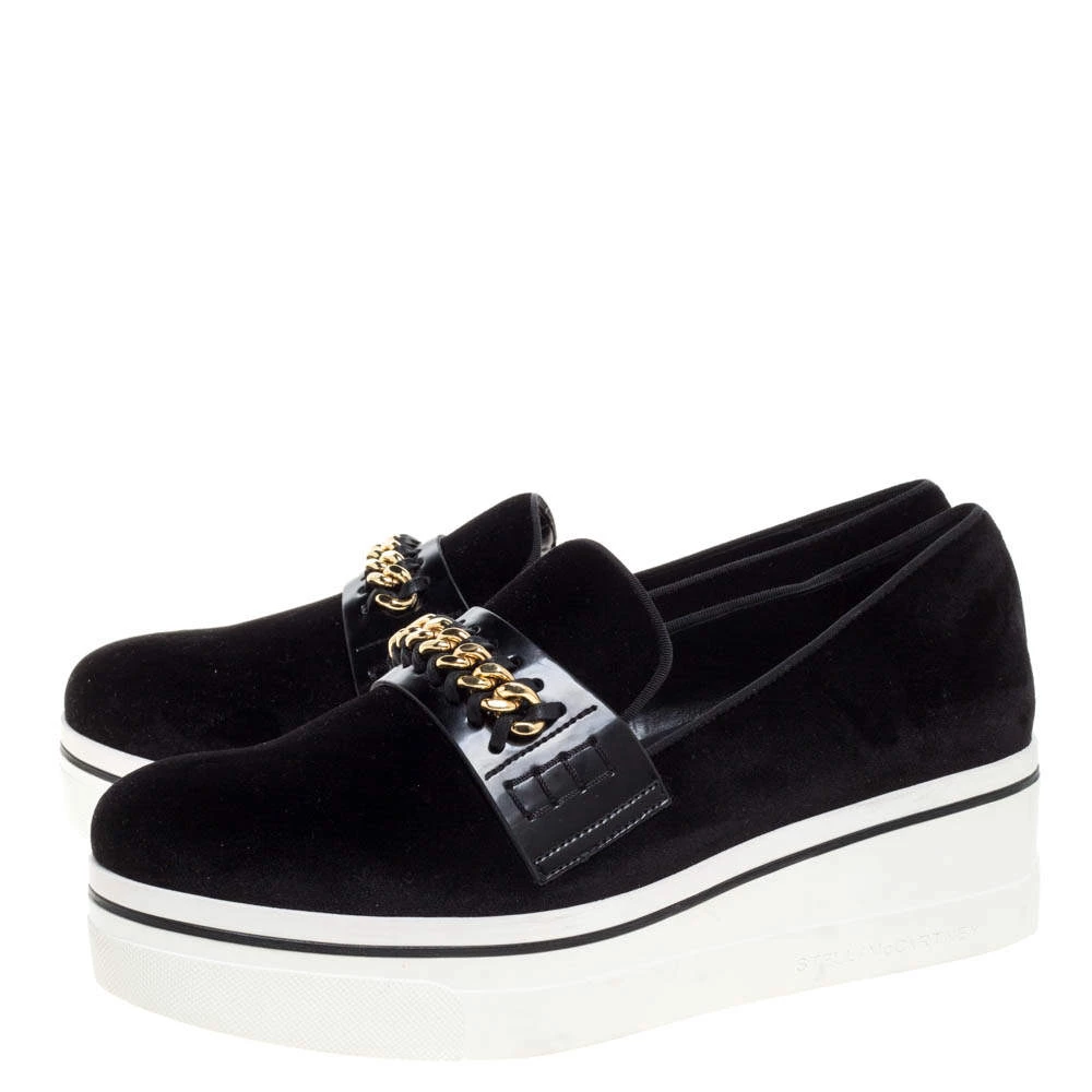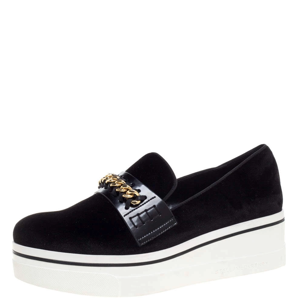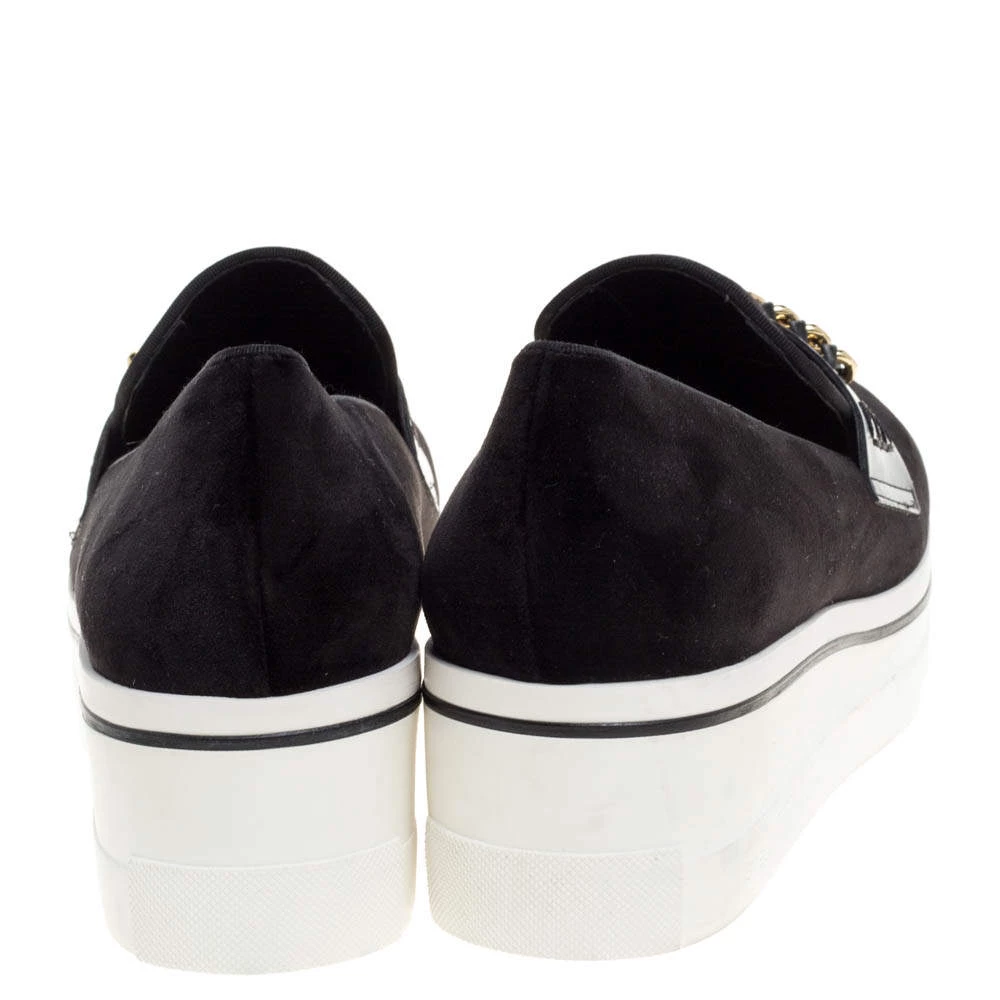Wear it through the day or look effortlessly stylish and comfortable for the evenings out wearing these stunning Stella McCartney platform slip-on sneakers. With a black suede surface and eye-catching chain trim on the faux leather panel, these sneakers feature a white rubber sole that gives you height while looking extremely stylish.