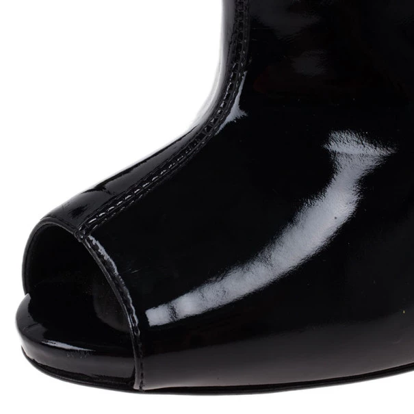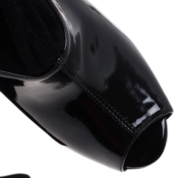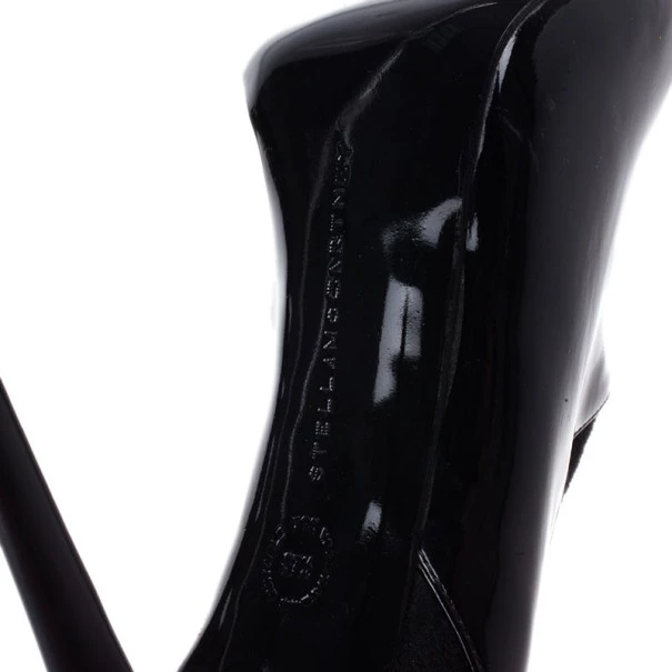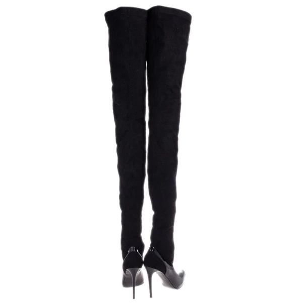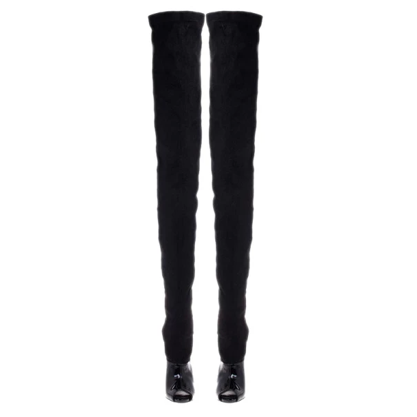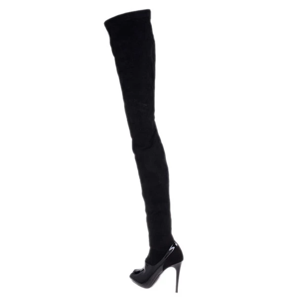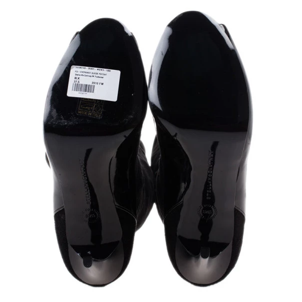 These Stella McCartney Over The Knee Boots are absolutely breathtaking! Crafted from black patent leather and suede, they feature peep toe caps, leather vamps and suede tops. Lined with leather, these fabulous boots carry Stella McCartney labeled insoles. Add these to your outfit for a super stylish look. Original Retail Price: US $1,075
