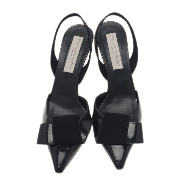 Make a classic fashion statement with these Stella McCartney black patent slingback sandals. They feature black glossy leather uppers with cute fold-over motifs on the front. The also feature pointed toes, and 7cm heels.