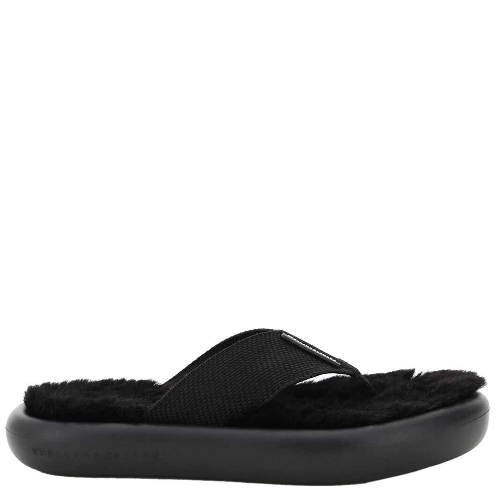 Stella McCartney Black Rubber Air Thong Mules With Faux Fur Flats Size IT 37 For Women