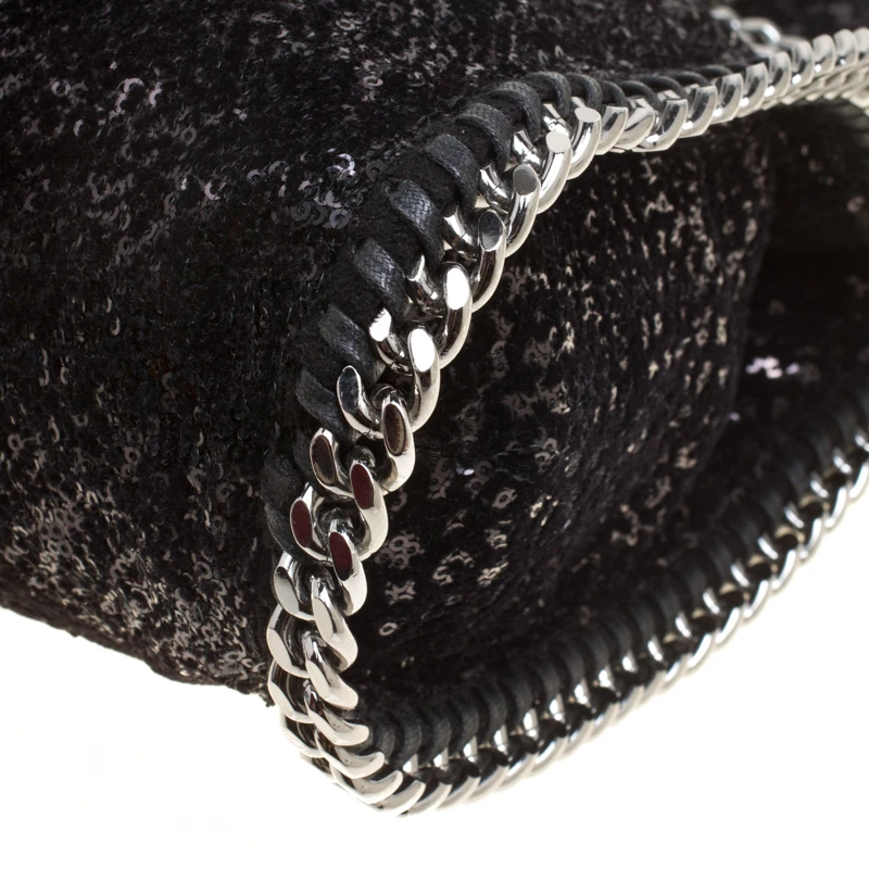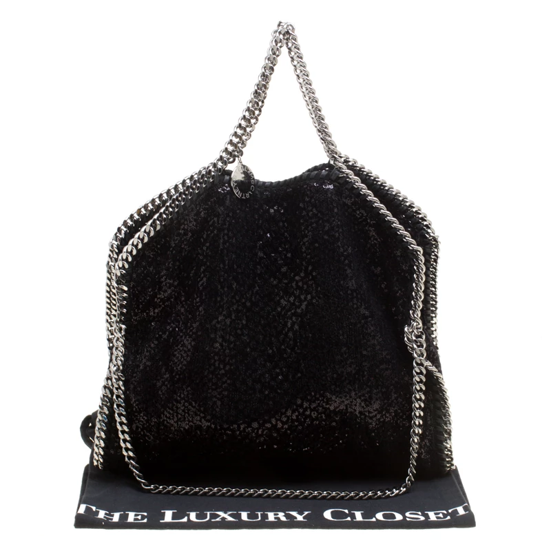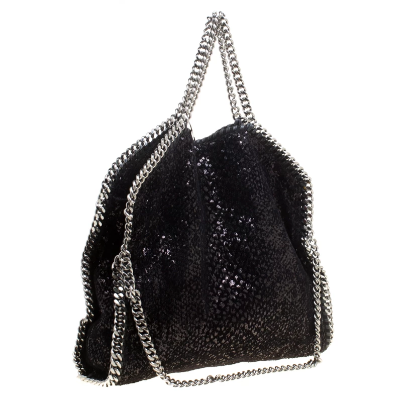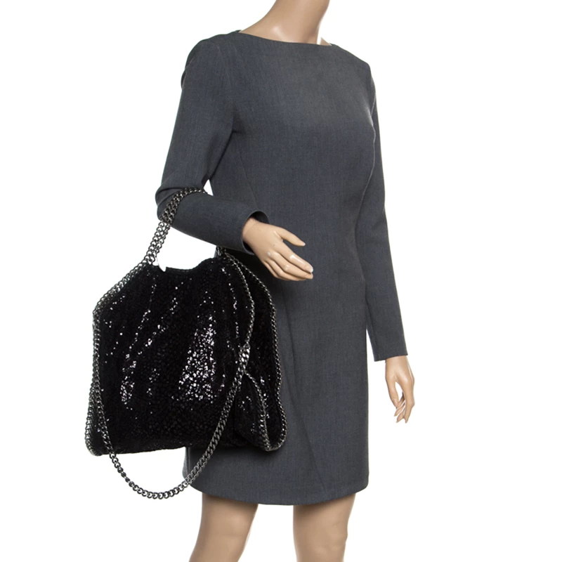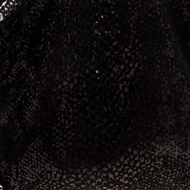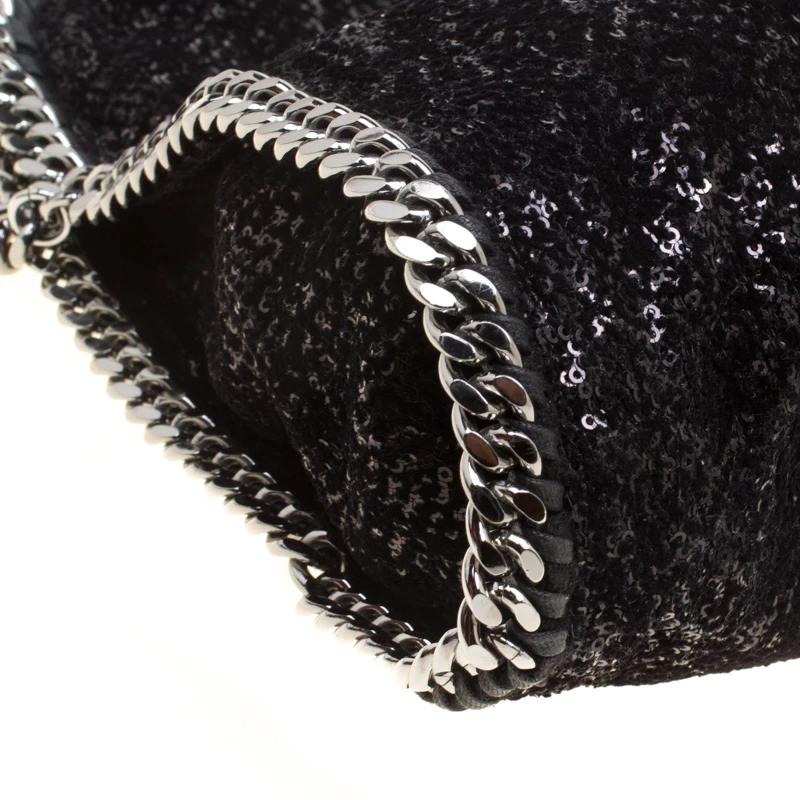 Stella McCartney is known for her chic designs and this Falabella tote perfectly embodies this trait. Crafted in Italy from black sequins and velvet with a fabric interior, this tote has a beautiful glittering exterior and black-tone chain details at its contours and as handles. This bag can be carried with your everyday outfits.