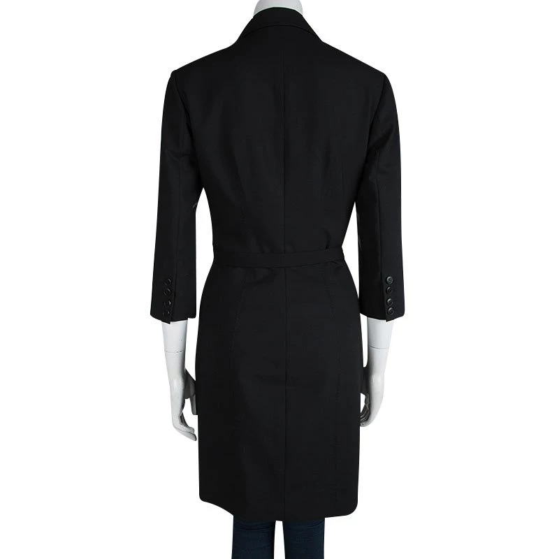 Look different with this double-breasted black coat with a regular lapel and three quarters sleeves. Stella McCartney gives this coat a softer look with superior wool and a belt to hold in the waist. The knee-length coat can be worn with trousers or even leggings with a matching pair of heels.