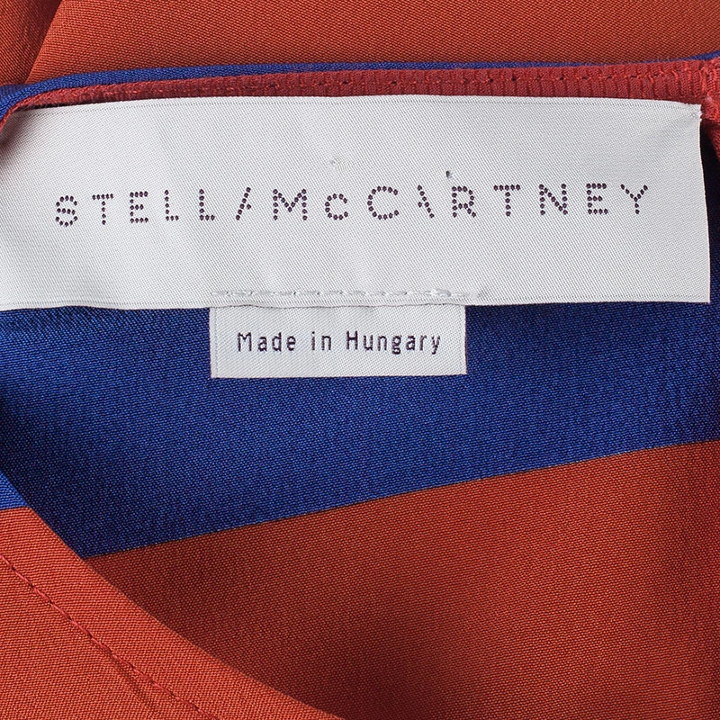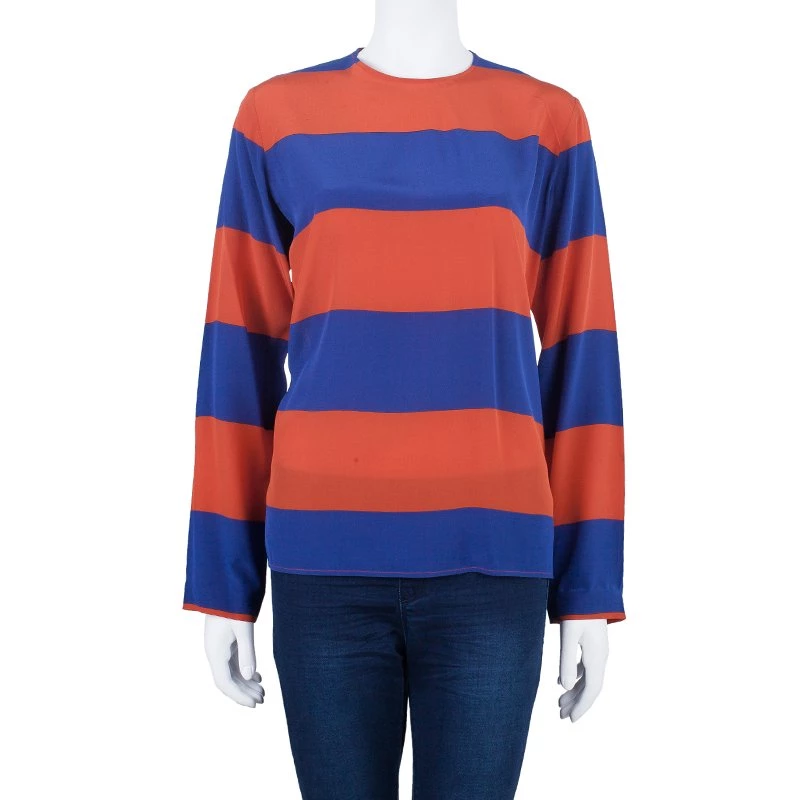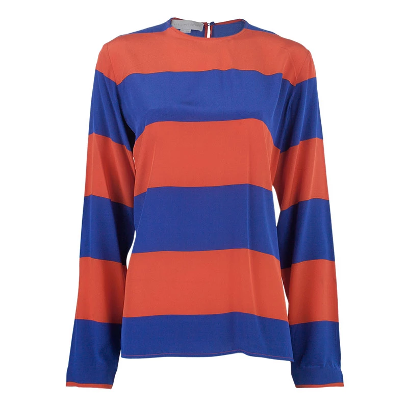 This blue and orange top by Stella McCartney is given a sporty, collegiate feel with bold stripes. Crafted in silk and cut to sit slim against the body with a simple collarless neckline, the fit is fluid and elegant. Wear it to add a little punch to classic tailored trousers.
