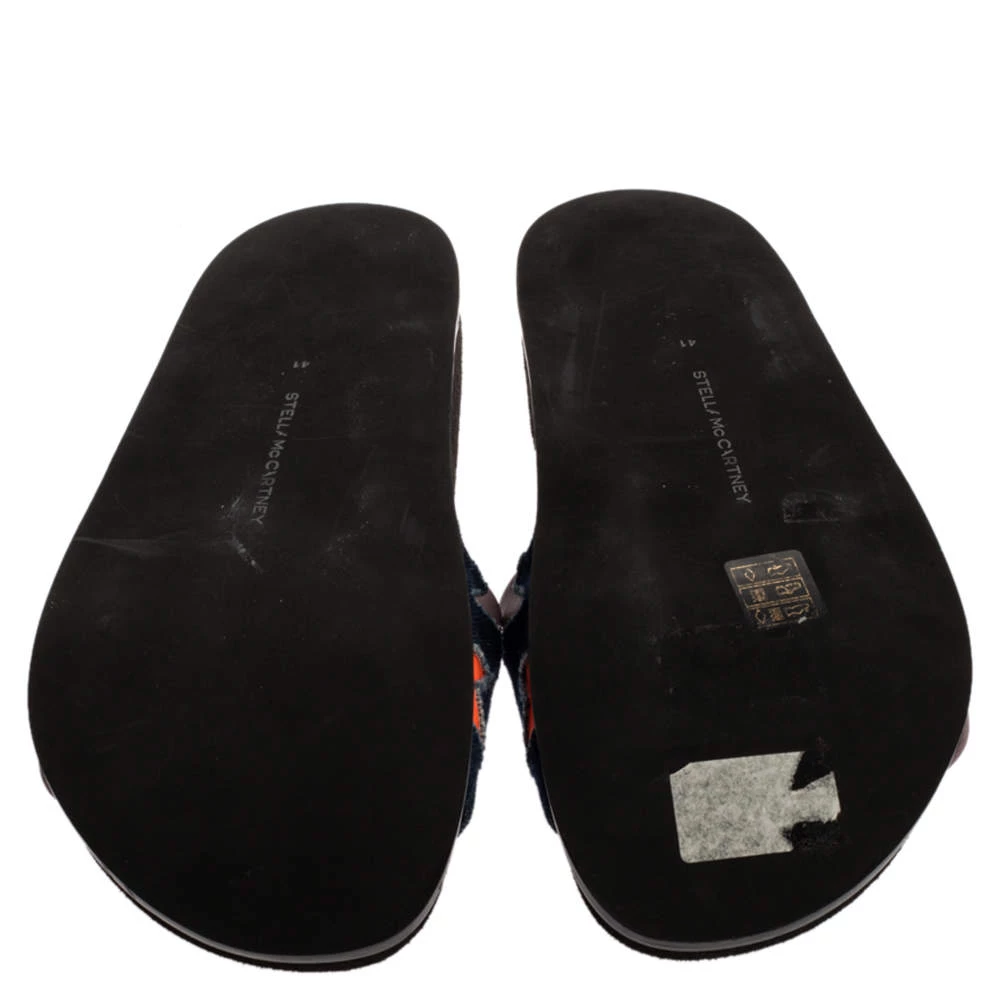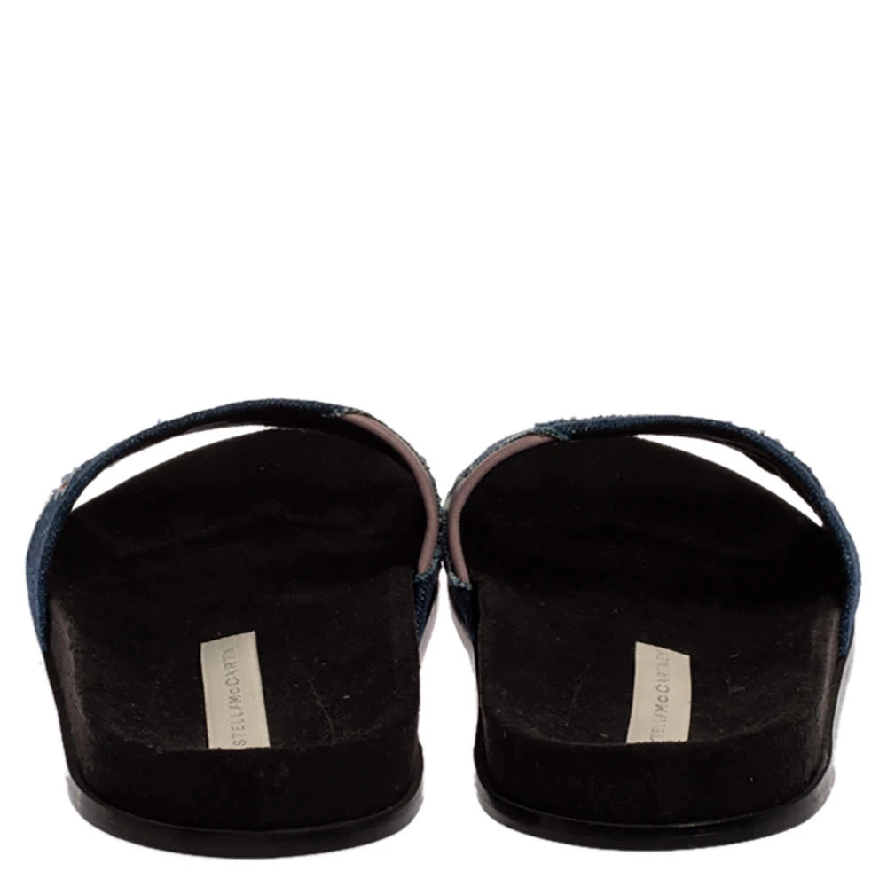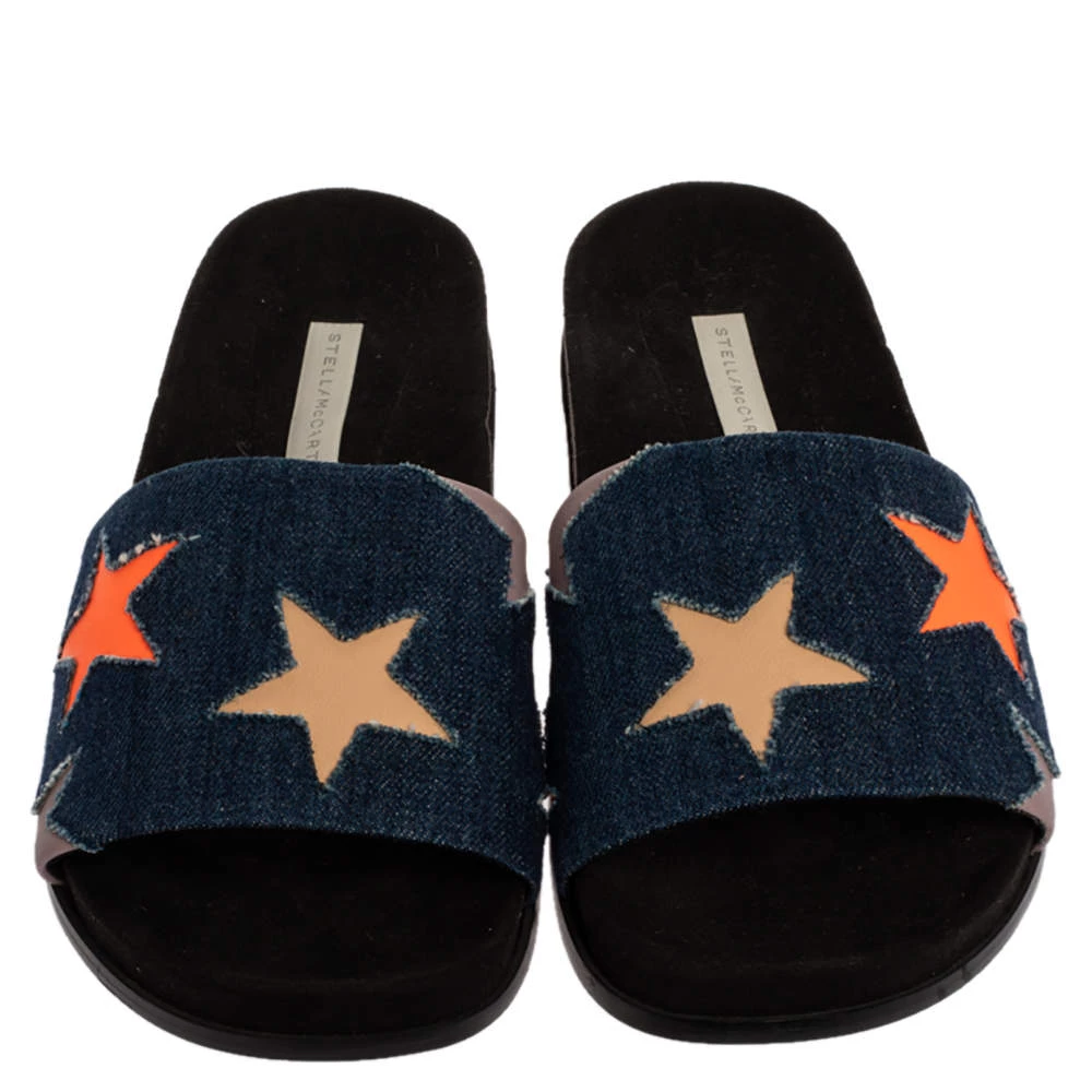 Comfort, luxury, and fashion come combined in these slides from Stella McCartney! They are designed with blue denim front straps detailed with stars and faux suede insoles for your ease. The slides are made for your casual style.