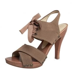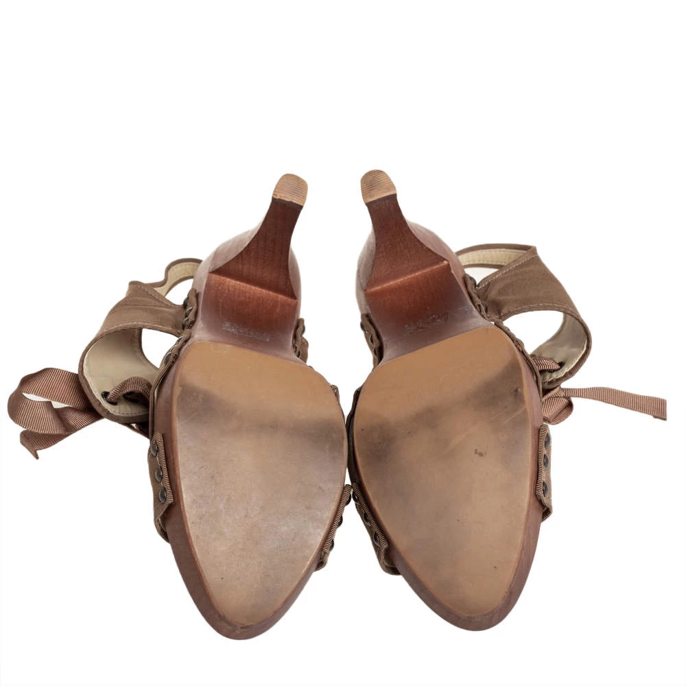 These stylish Stella McCartney sandals are crafted from brown-hued fabric and form a crisscross strappy design to form an open-toe style. They are adorned with laces and 10.5 cm high heels supported by platforms.