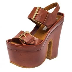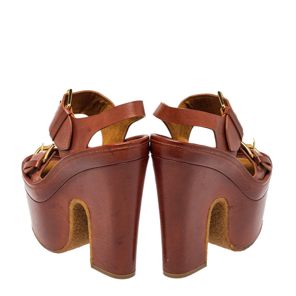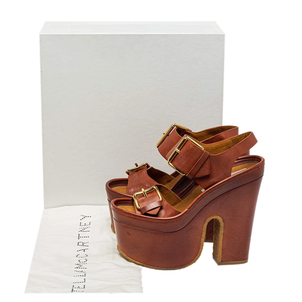 You are sure to feel your fashionable best every time you step out in these sandals from Stella McCartney! Beautifully designed using faux leather, they successfully present a statement appeal. The brown pair carries open toes, ankle fastening, platforms, and block heels.