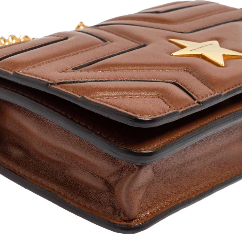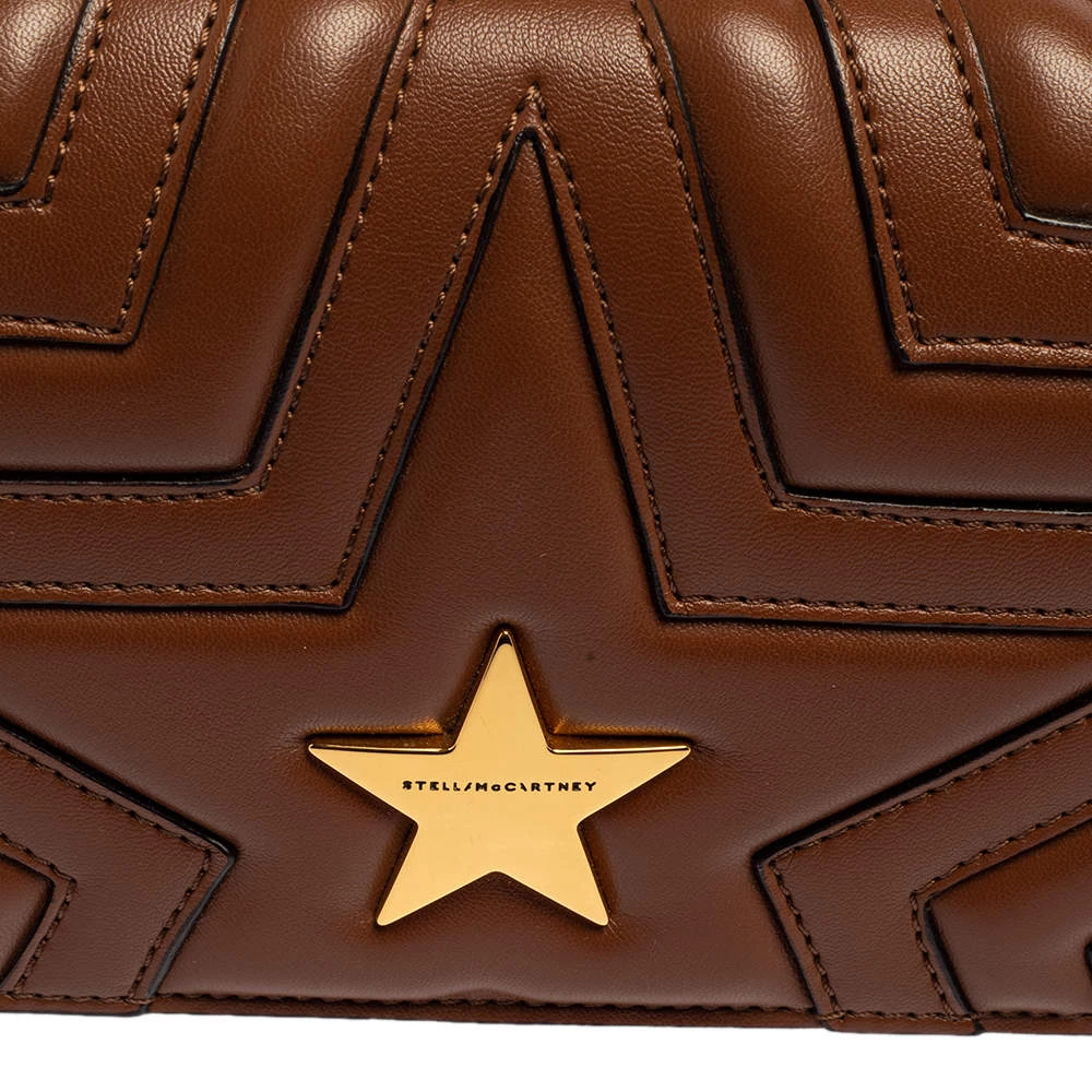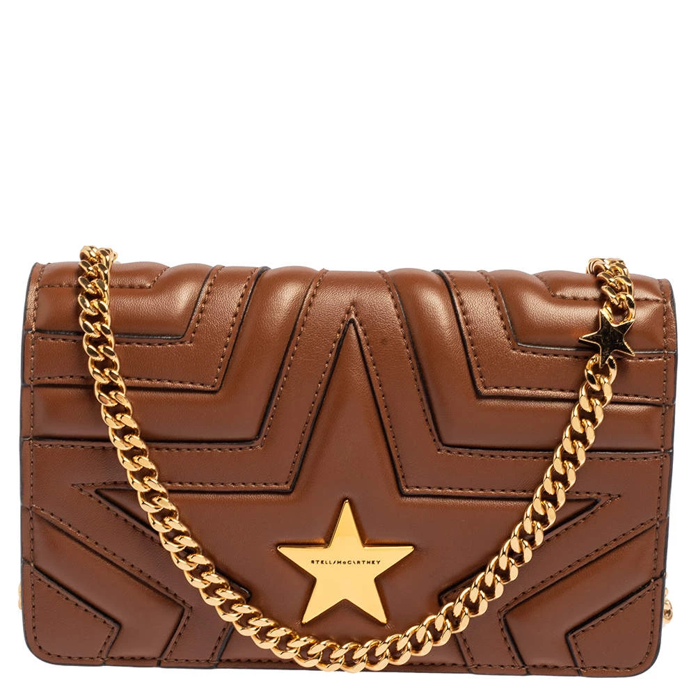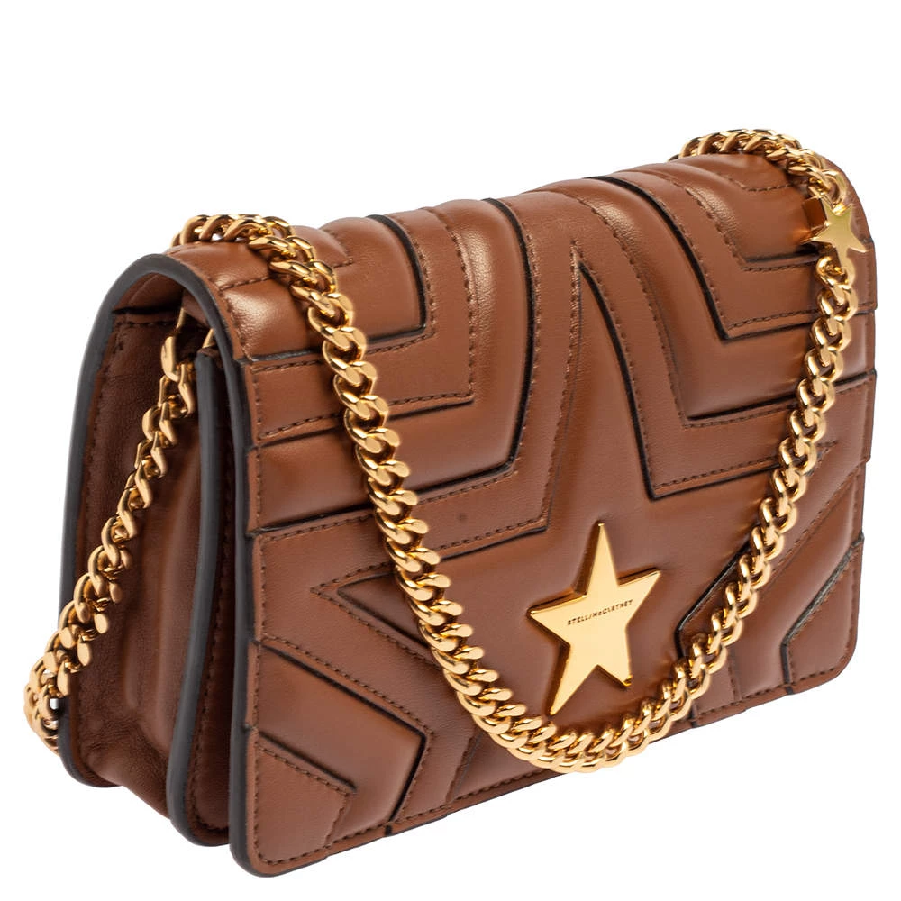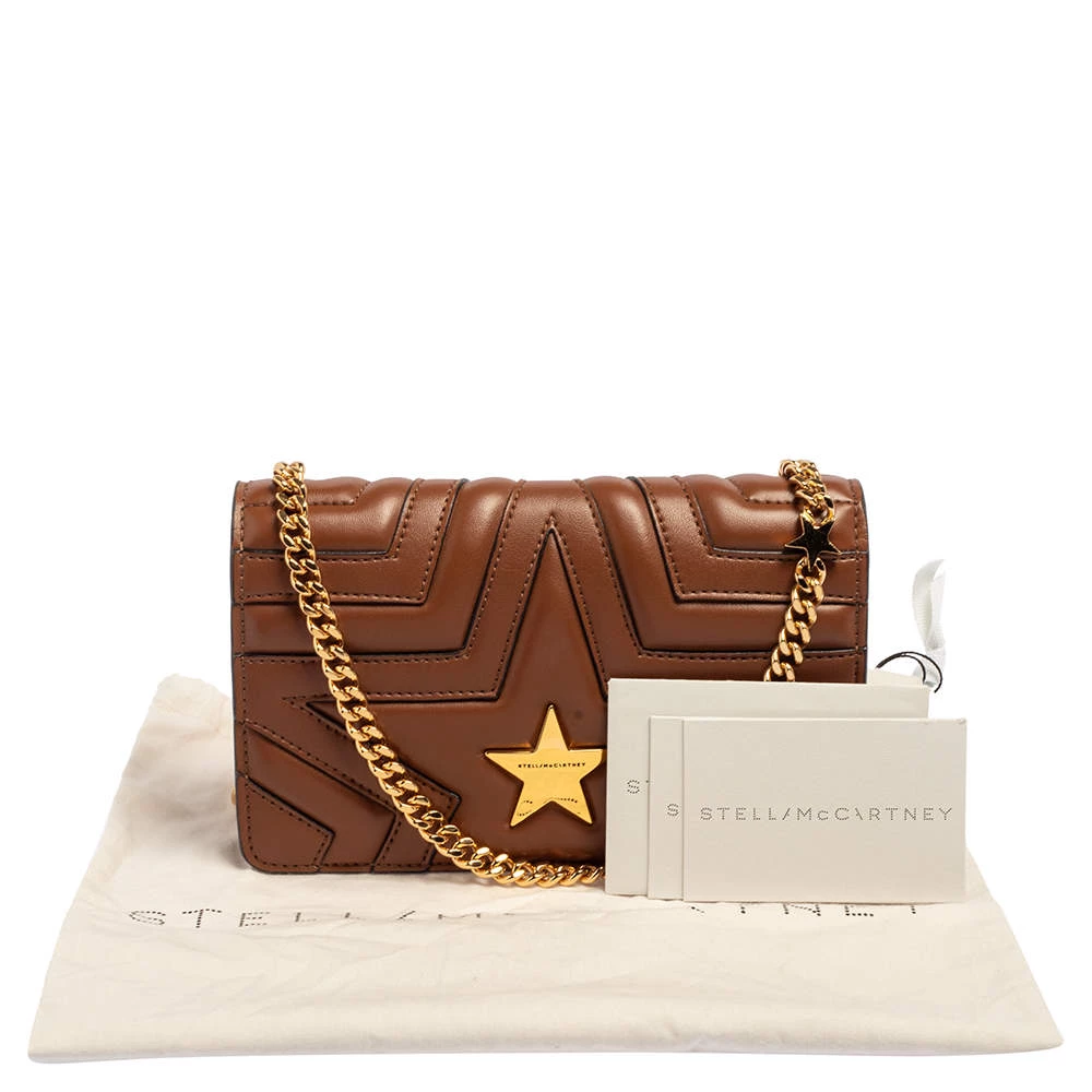 Make a wonderful appearance by adorning this plush bag by Stella McCartney. Crafted from faux leather, it comes in a lovely shade of brown. It features a quilted star pattern and the brand’s logo makes an appearance on a star-shaped emblem on the front flap. The Alcantara-lined interior is sized to house your essentials. The bag is complete with a gold-tone chain-link strap.