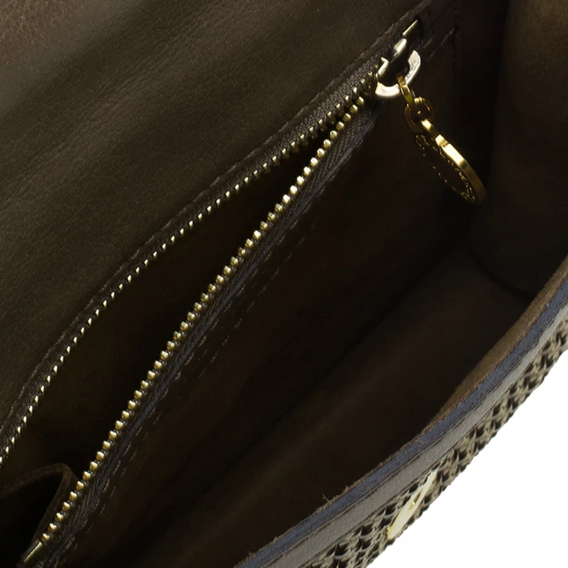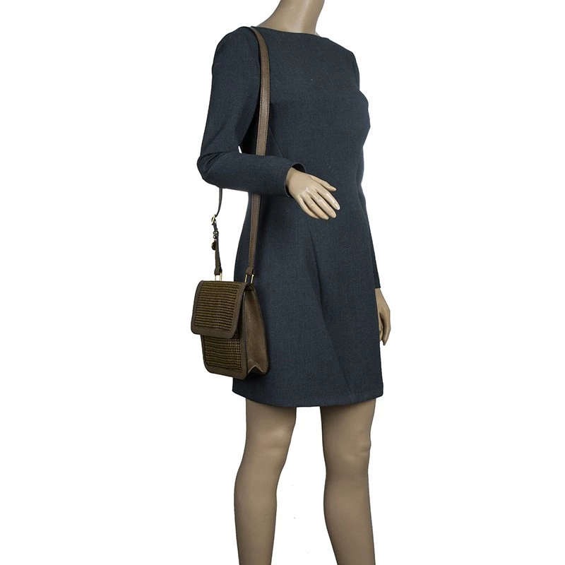 Add that glam factor to your looks with this practical cross body bag from the house of Stella McCartney. Crafted from brown faux leather with woven details, it features a flap opening, a shoulder strap supported with gold-tone hardware and a back pocket. Lined with faux suede, it has a zipper pocket.