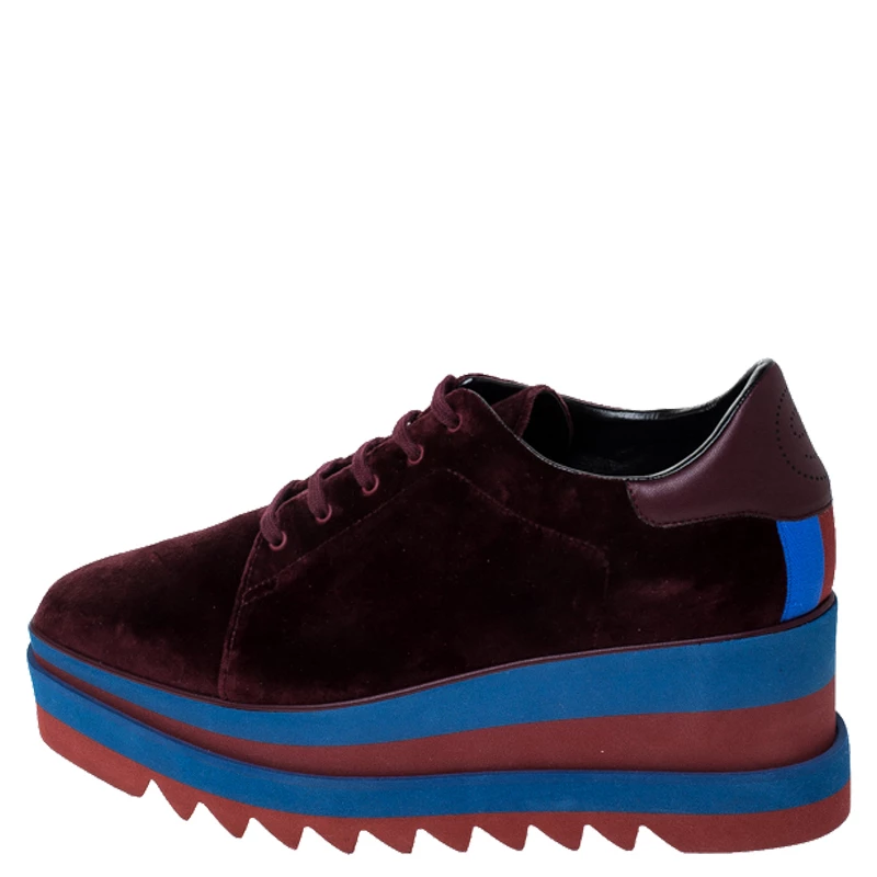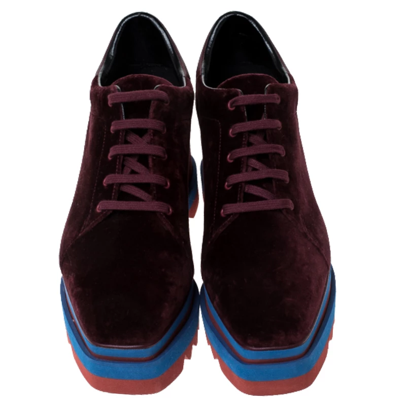 Stella McCartney proves her high style and unique fashion taste with these Elyse derby shoes. They are brimming with exquisite details like the lush burgundy velvet exterior, the matching laces, and the thick serrated platforms. Grab this pair today and let it help you express your fabulous style.