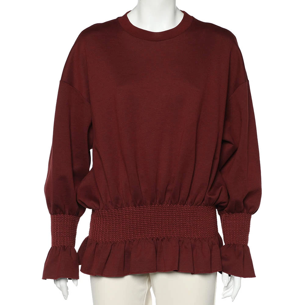 This burgundy sweatshirt by Stella McCartney skillfully merges elegant tailoring with a casual, loose silhouette. The cotton knit piece has a comfortable fit and a smocked design that will look great with both pants and skirts.