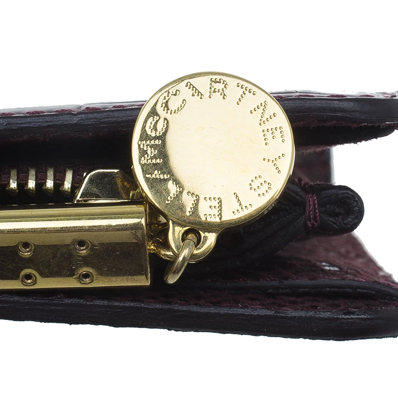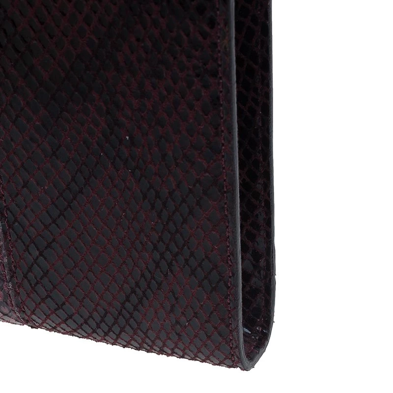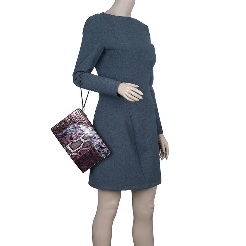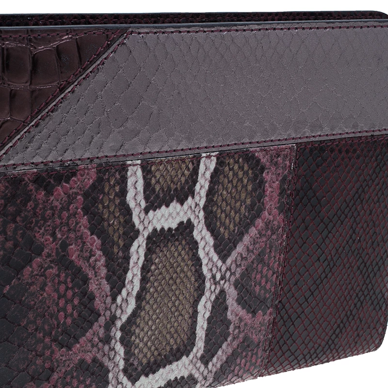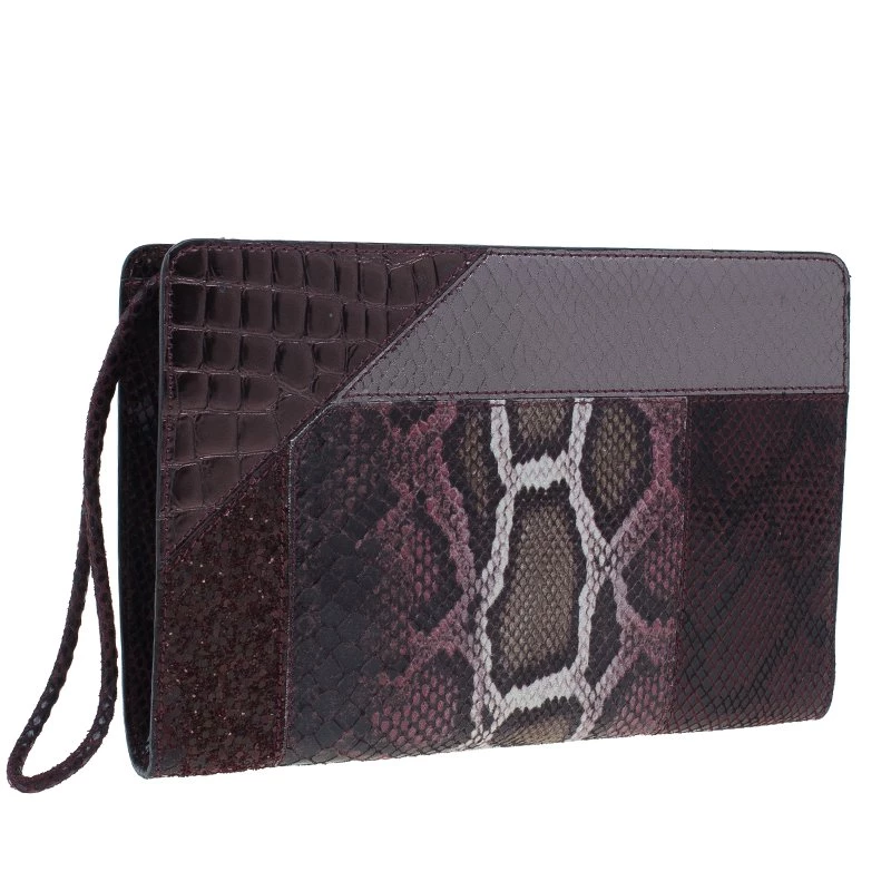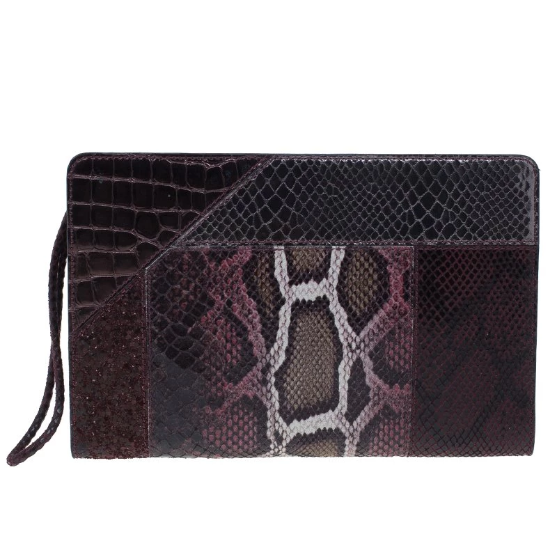 This Stella McCartney Burgundy Embossed Patchwork Clutch will bring out your wild side. Its faux leather exterior is patched with python and crocodile leather, creating an interesting look. It is coupled with a wrist-let and includes gold-tone hardware stud with perforated brand detailing. Lined with monogrammed fabric, the interior houses one zipped and two open compartments and showcases a magnetic closures.