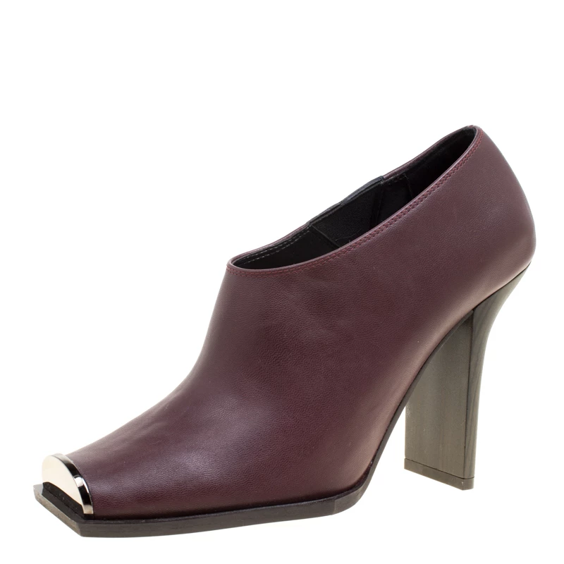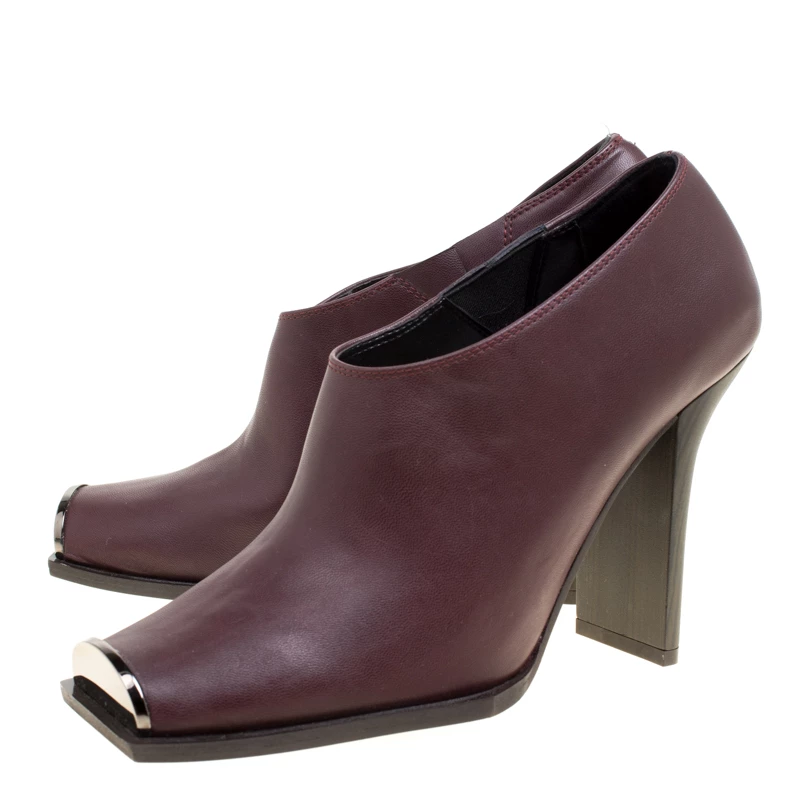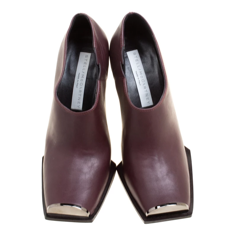 Chic, stylish and very modern, these Stella Mccartney ankle boots are perfect for the fashionable you! The burgundy boots are crafted from faux leather and feature square toes with gunmetal hardware detailing. They come equipped with comfortable insoles and 10.5 cm heels. Pair them with cuffed denims for your fashionable utings.