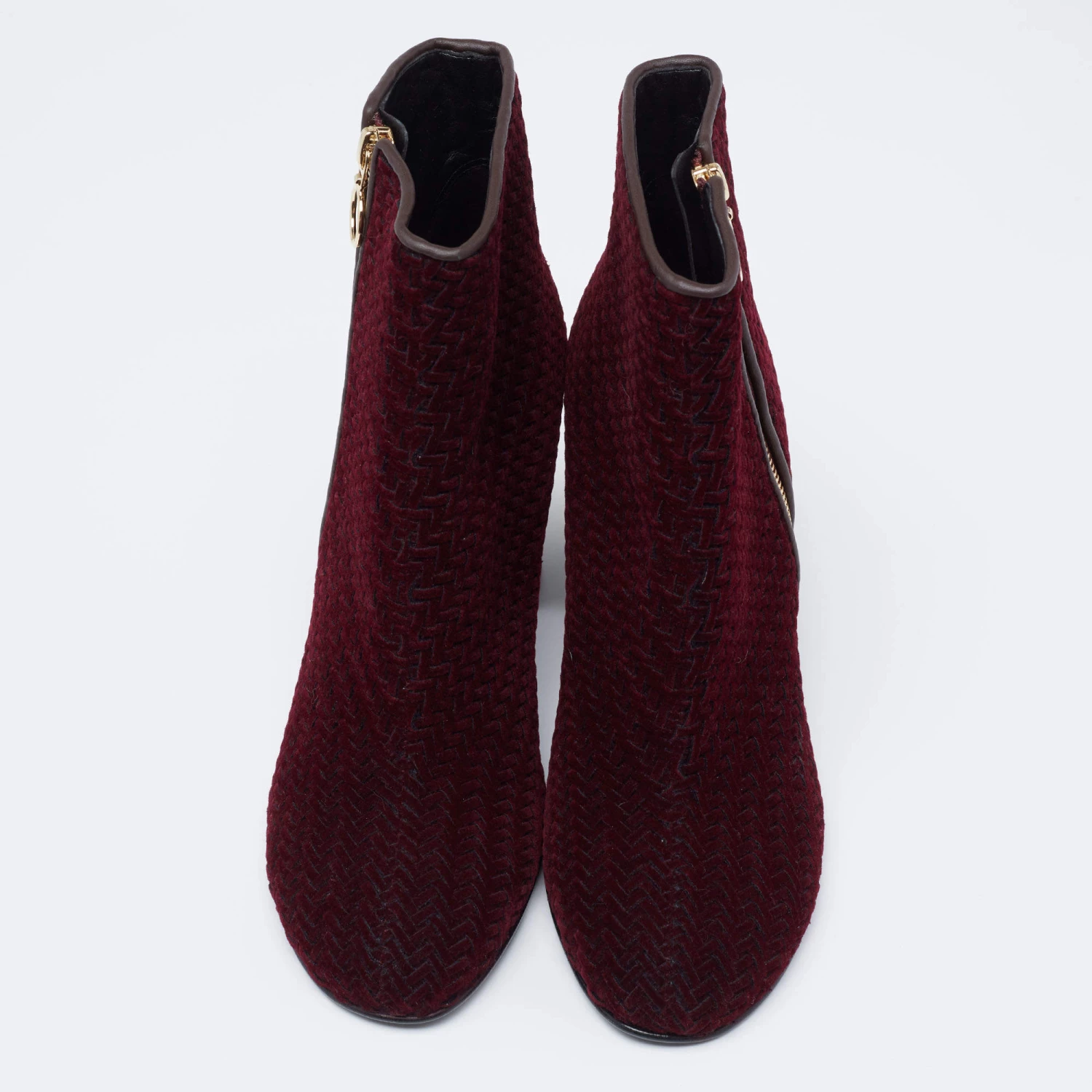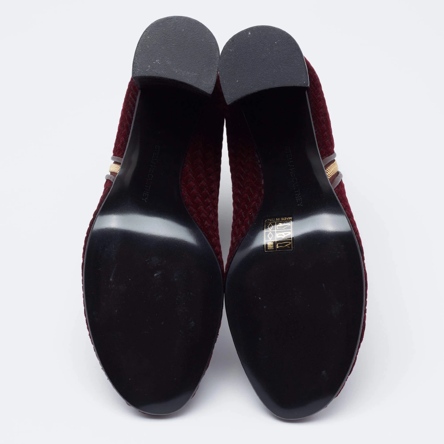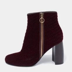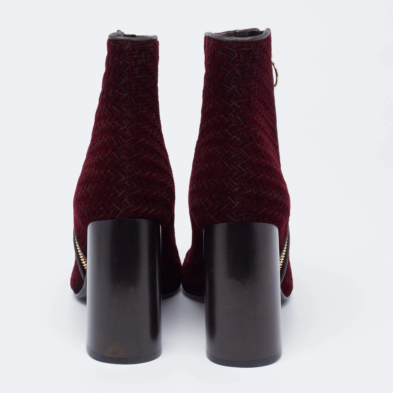 Take every step with confidence and panache in these stunning boots from Stella McCartney. They are styled using burgundy woven velvet into an ankle-length silhouette. They flaunt gold-tone hardware and block heels. These gorgeous boots are going to be your favorite in no time!