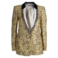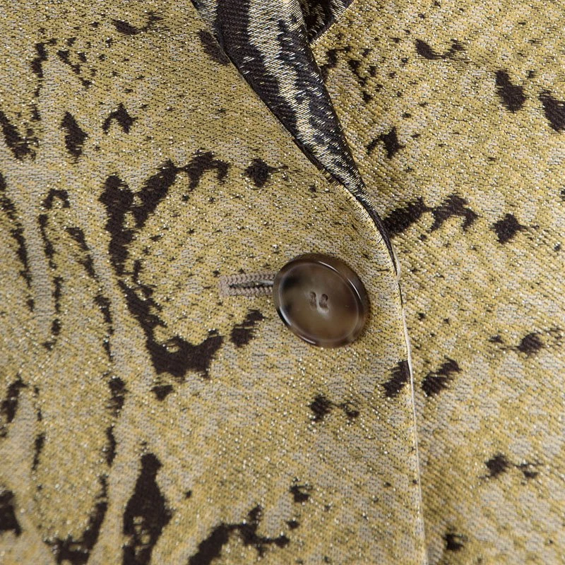 Made with a combination of rayon, cotton, silk, and polyester and a button to fasten in the front and two front pockets give this jazzy reptile print jacket a retro party vibe. Make a statement at parties with the deep, plunging neckline.