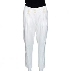 These trousers from Stella McCartney are the perfect option for the next formal event you have to attend. Crafted from coated silk, they carry a cream hue. These tapered trousers are styled with button closures, two pockets and a tailored fit. They will pair well with a host of shirts and heels.