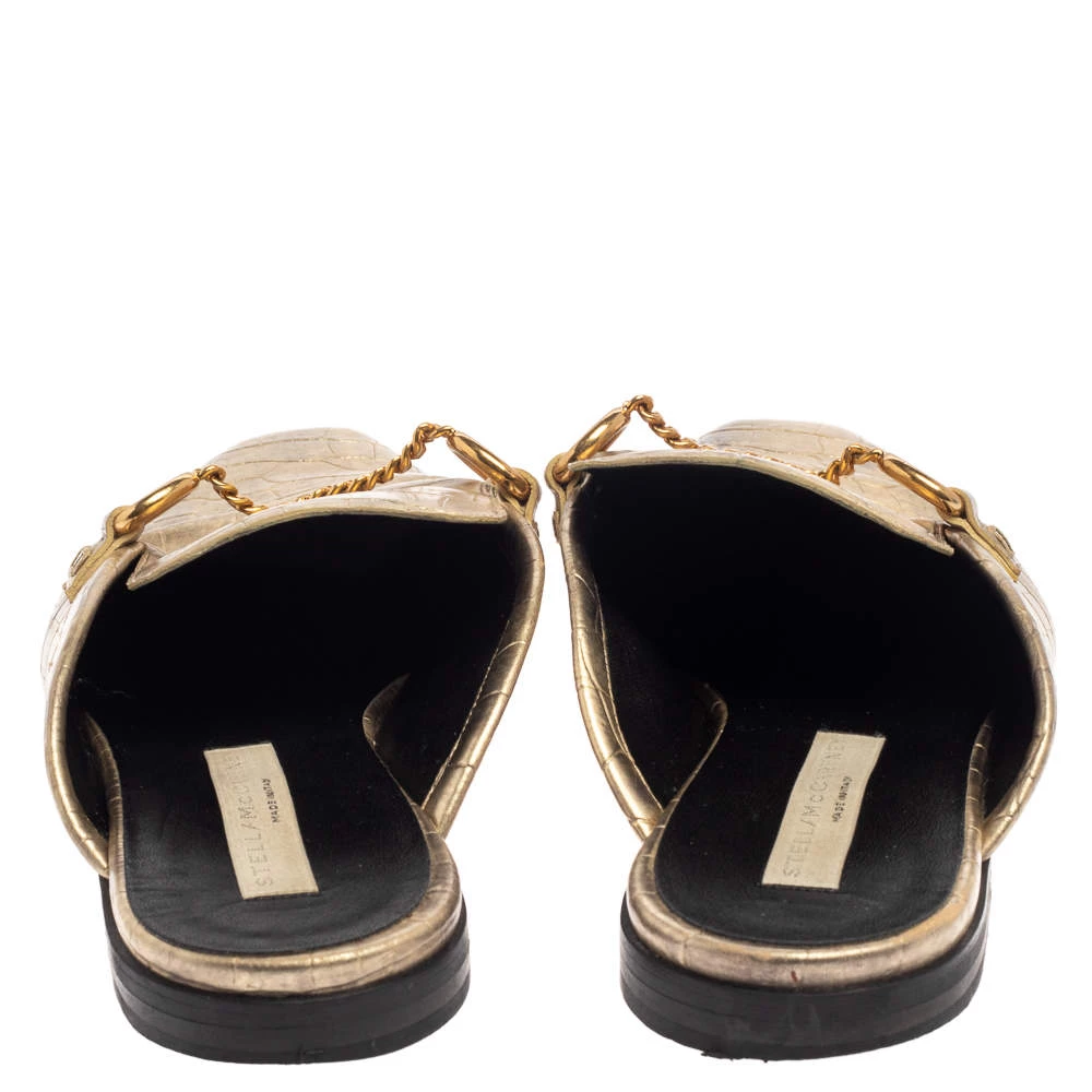 To complement your elegant ensemble with utmost ease and comfort comes these mules from Stella McCartney. Designed with almond toes and a flat sole, the gold croc-embossed exterior of the pair is beautifully accented with gold-tone chain detail on the vamps, giving these mules a distinguished touch.