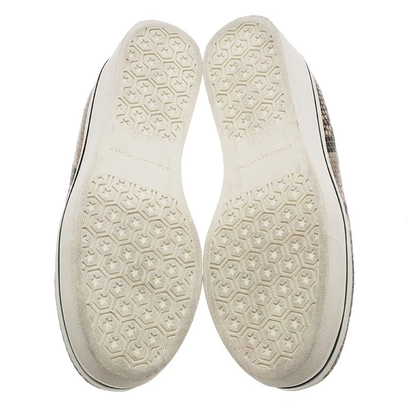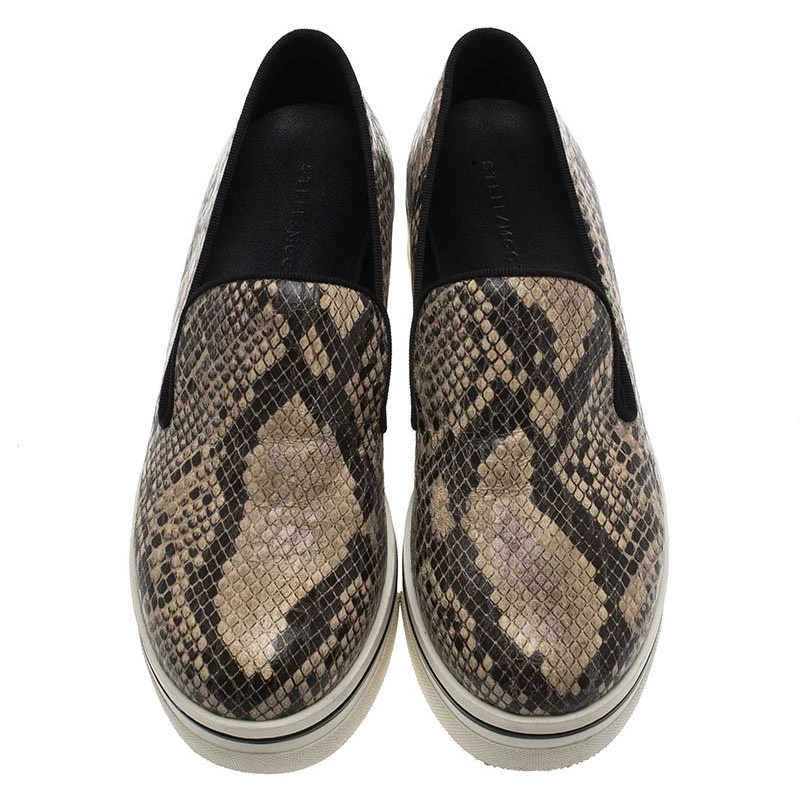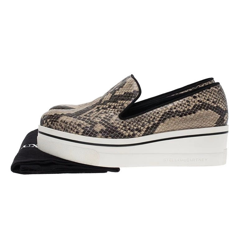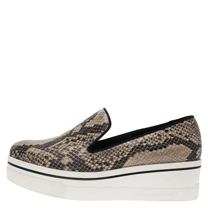 Stella McCartney has outdone herself yet again with her fashion line’s collection of footwear. This pair of sneakers featuring a platform heel is quite the showstopper. An easy to slip-on pair, the sneakers feature a faux python print and is faded grey in colour.