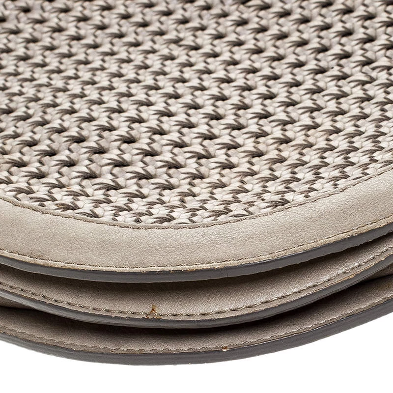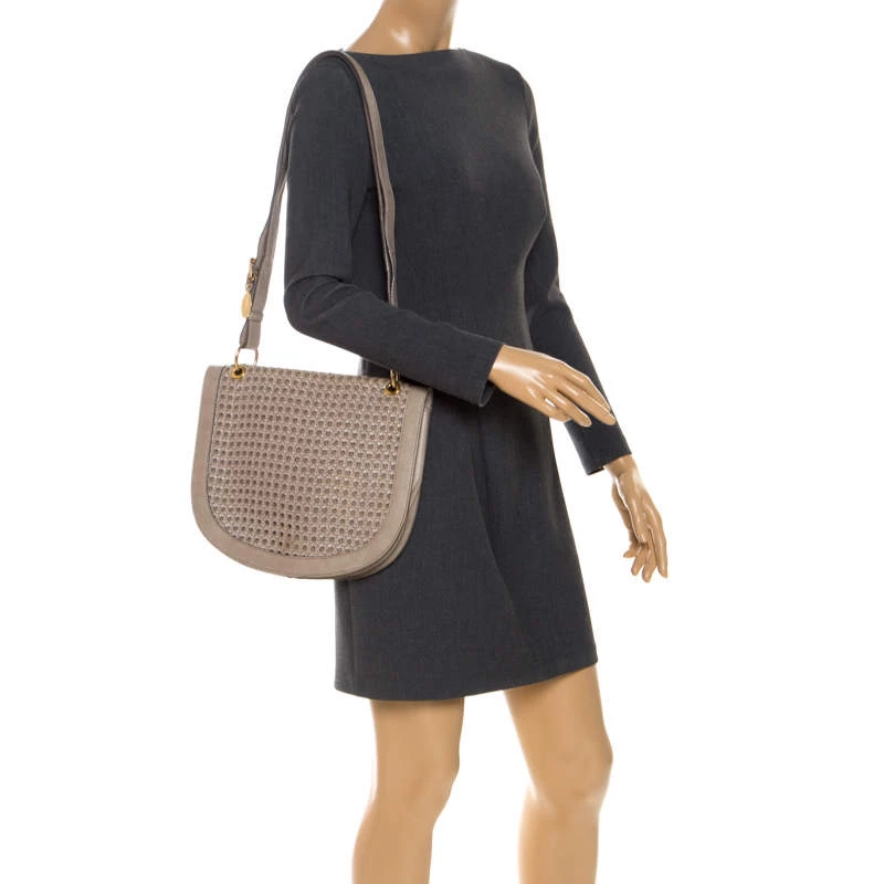Carry this bag from Stella McCartney without compromising on style. This woven leather bag comes in a ‘U’ shape with a flap. This chic grey bag opens to a leather-lined interior and is held by a shoulder strap.
