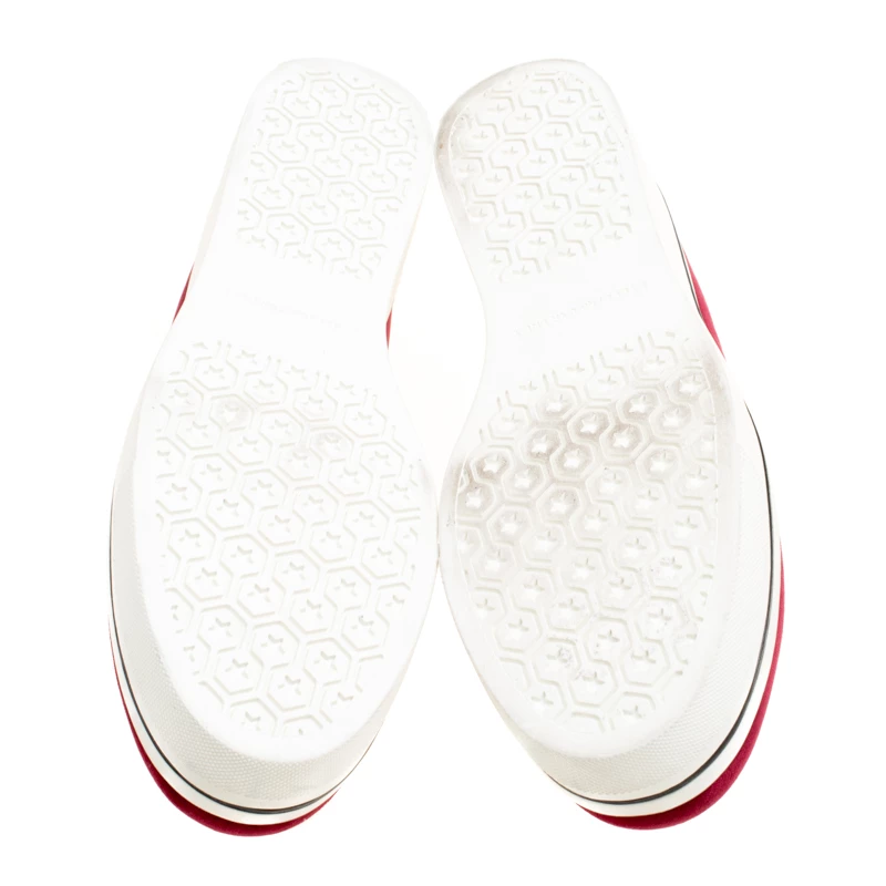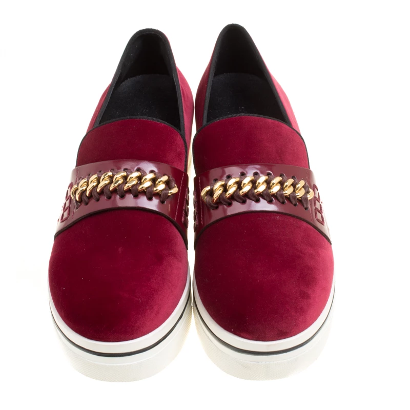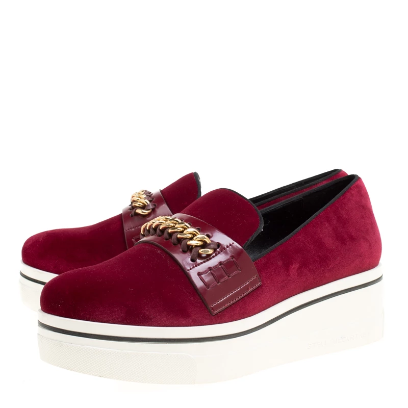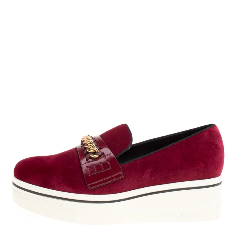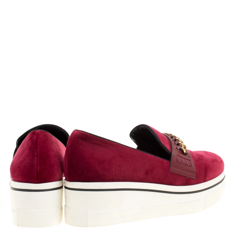 Designed in maroon velvet, these Stella McCartney loafers are a chic choice for the season. Set on a broad white sole for added comfort, height and cushioning, this pair comes with a faux leather trim on the vamps accented with gold-tone chain details. Wear with summer dresses or casual denim and tee look.