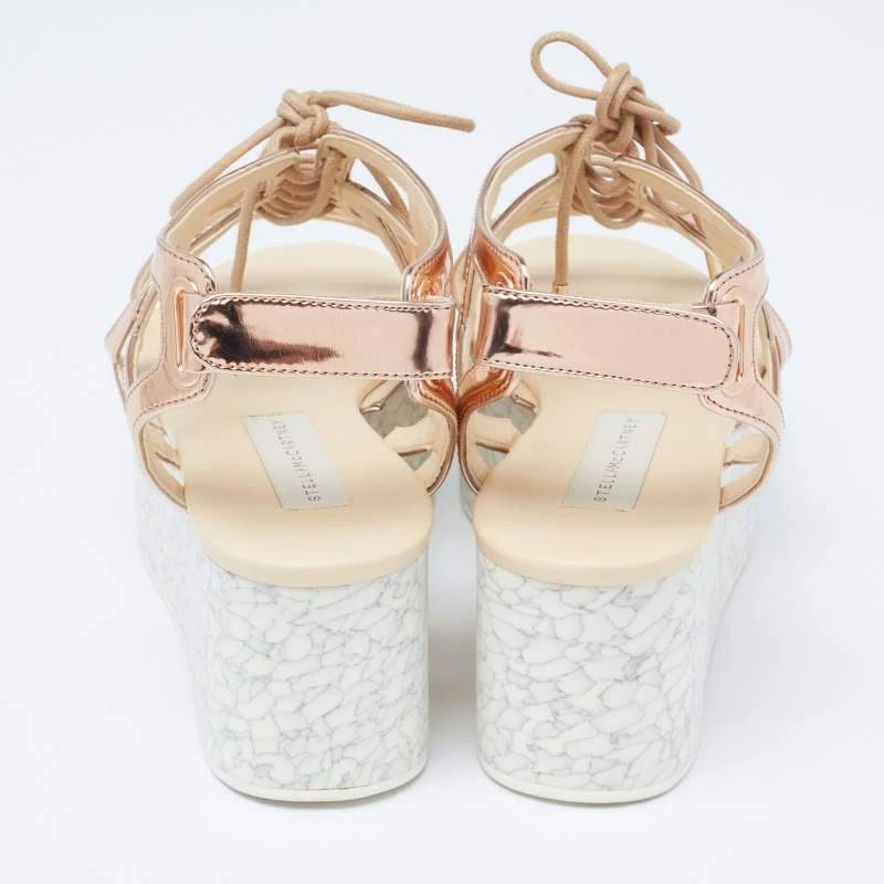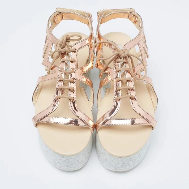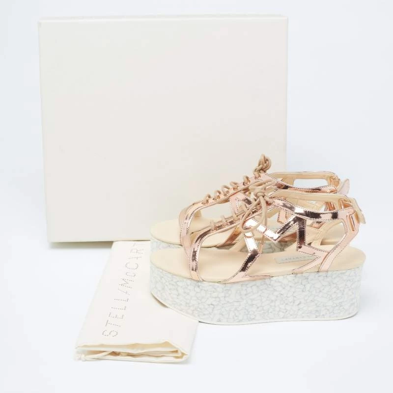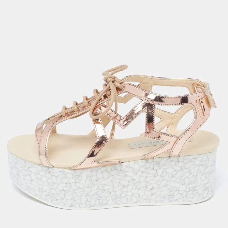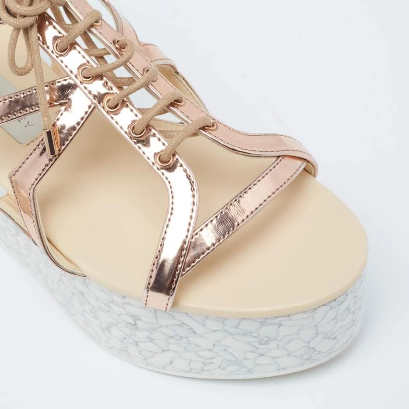With lace-up vamps and platforms, these Stella McCartney women’s sandals are highly fashionable. Created from faux patent leather in a metallic bronze hue, the pair features rubber soles, open toes, and velcro closure.