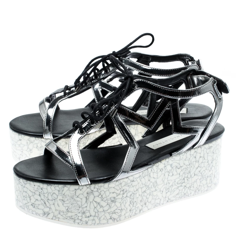 Stella McCartney is known for her posh designs and these sandals perfectly carry the trait. Crafted from faux leather, these sandals have a metallic dull silver exterior, printed wedge platforms, and lace-up details at the front. They feature straps cut out like stars on the sides and velcro fastening at the back.