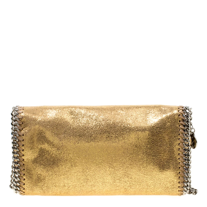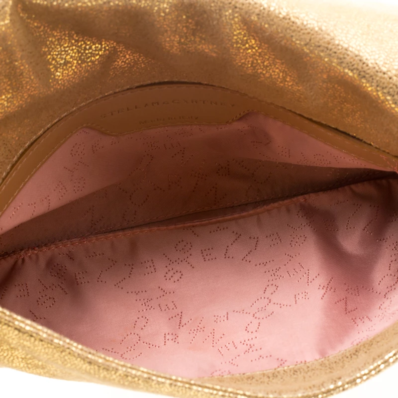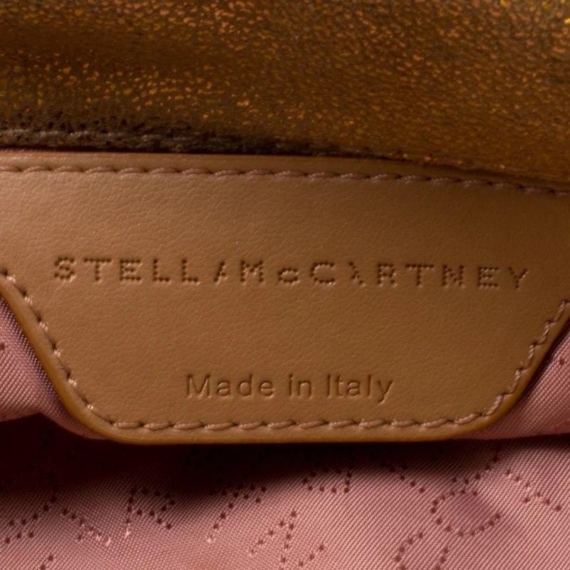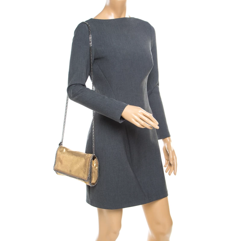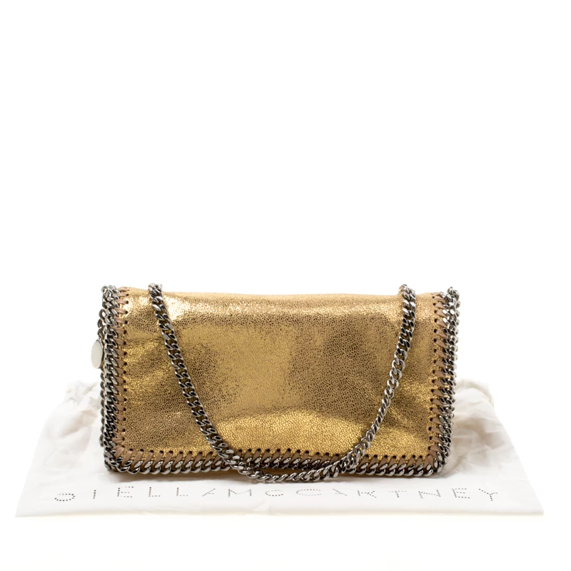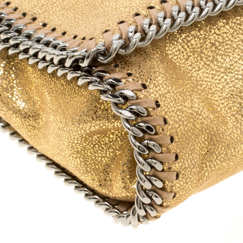 Stella McCartney is known for her chic designs and this Falabella tote perfectly embodies this trait. Crafted in Italy from metallic gold faux leather with a fabric interior, this bag has a beautiful exterior and silver tone chain details at its contours and as handles. This bag can be carried with your everyday outfits.
