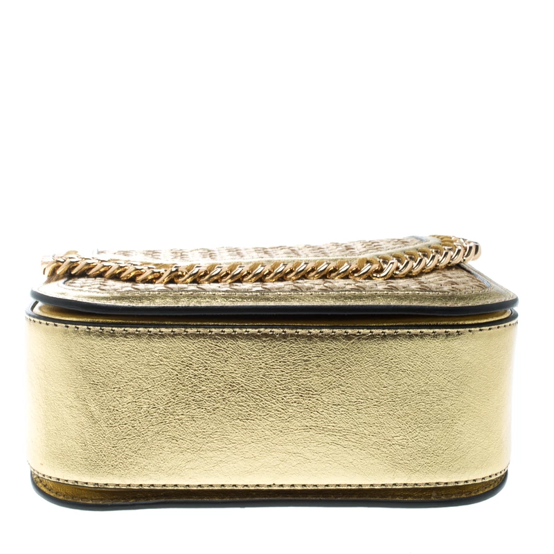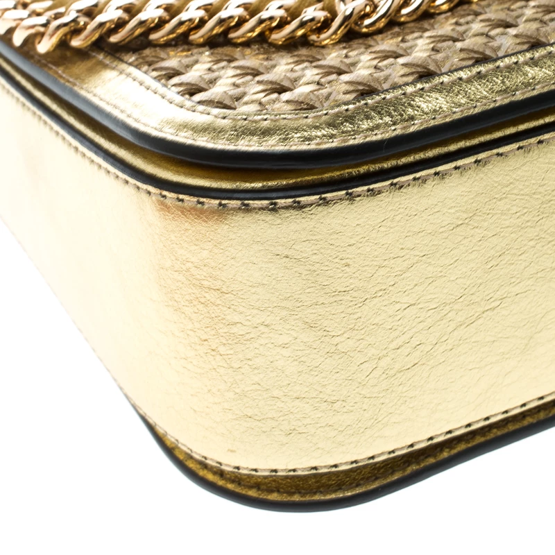 A refreshing version of your Falabella bags, this box shoulder bag is chic and elegant. Featuring a diamond-cut front flap detailed with chain-link trims, the bag is a blend of unique details and signature designs like the chain-link shoulder strap and metallic gold faux leather exterior. The bag is designed in a wicker pattern all over. It has a faux suede-lined interior that will stow your essentials. This bag will give your wardrobe a fashionable update.