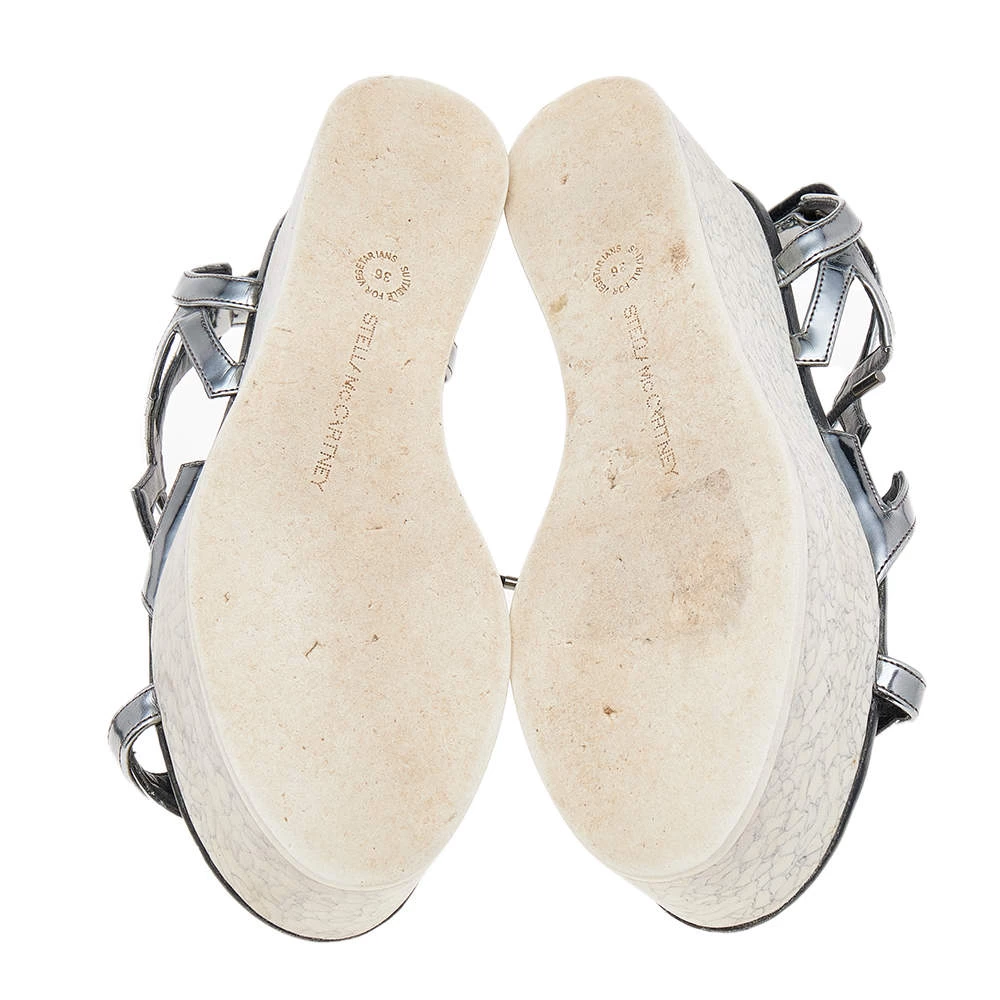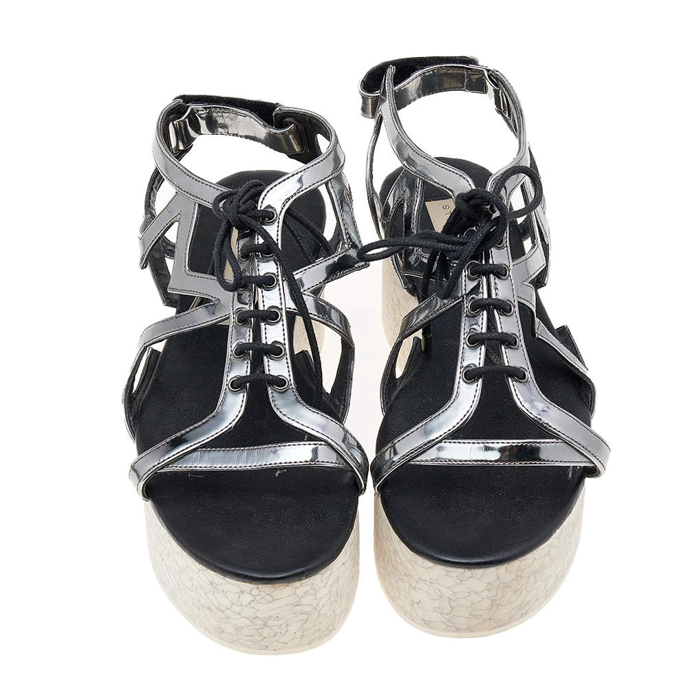 Crafted from faux leather, these sandals have a metallic grey exterior, marble-effect wedge platforms, and lace-up closure. They feature a cut-out star pattern on the sides and velcro fastening at the back.