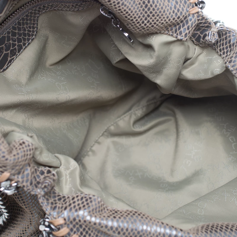 This Falabella shopper tote from Stella McCartney will make the dream of countless women come true. Crafted from faux python leather, it is durable and stylish. While the chain detailing elevate its beauty, the fabric-lined interior will dutifully hold all your daily essentials. You are sure to make hearts skip when you swing this tote using the chain handles.