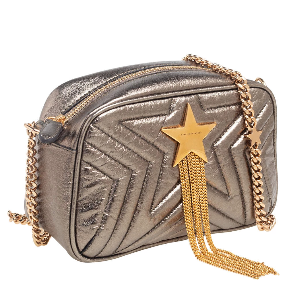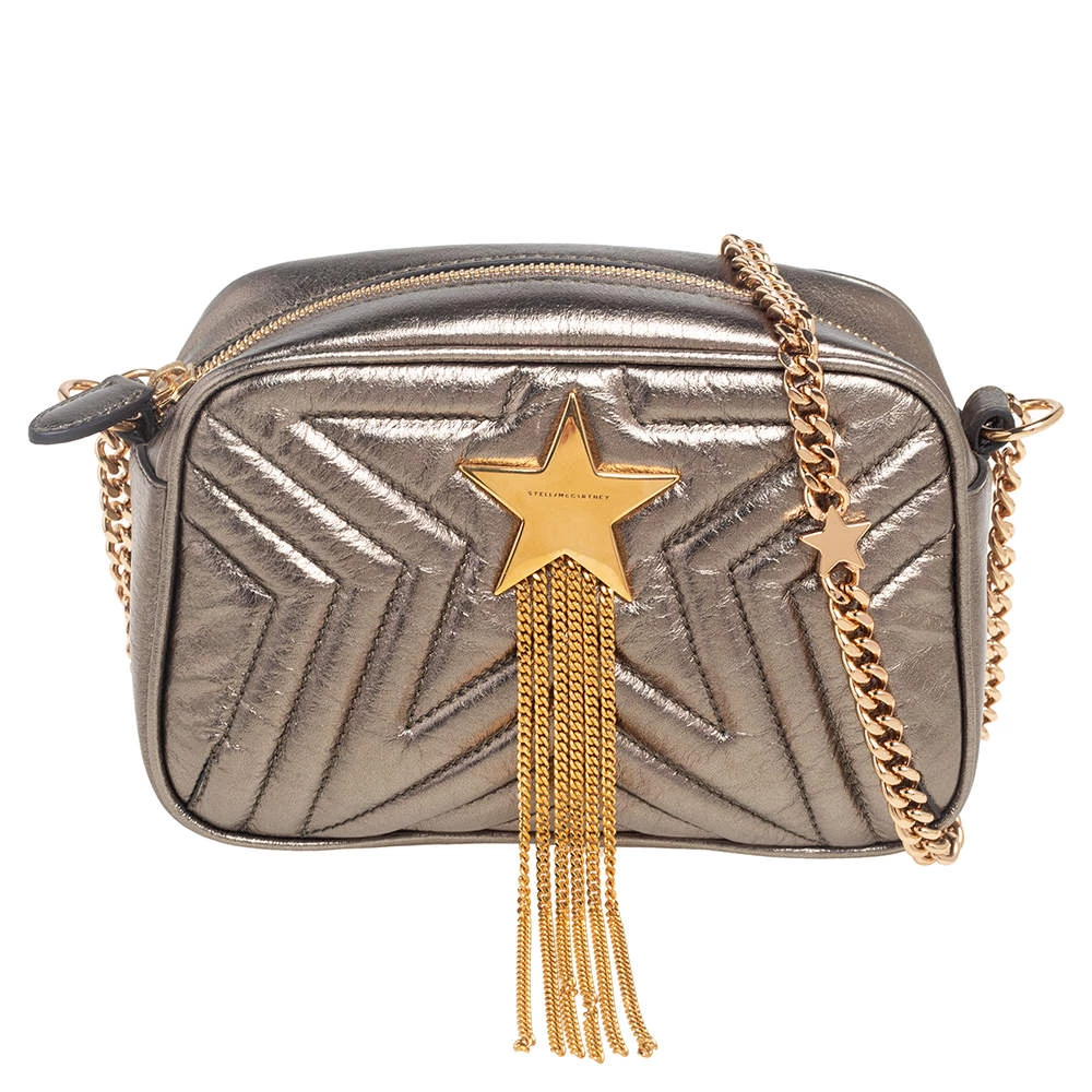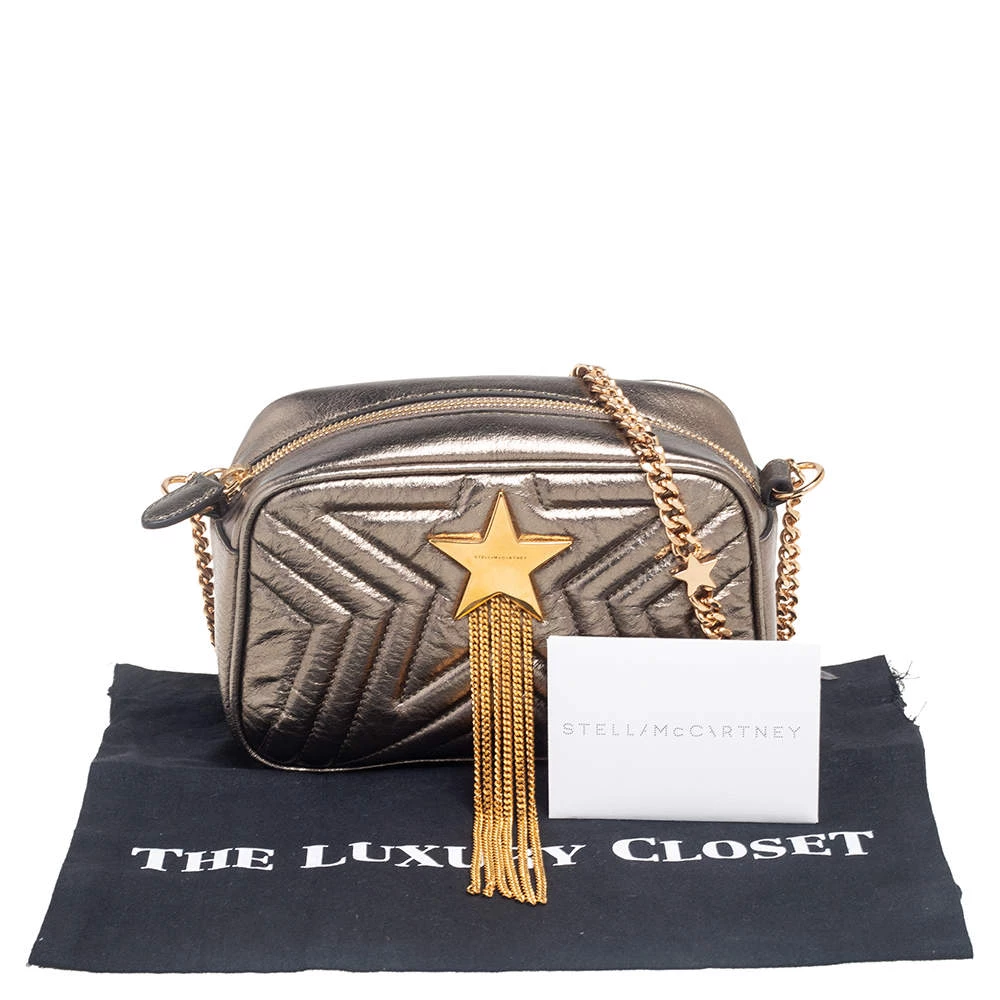 Coming from the House of Stella McCartney, this Stella Star crossbody bag will help your style sparkle! It is made from metallic olive green quilted faux leather and comes with a gold-toned star motif embellishment on the front. It has a faux suede-lined interior and a sturdy chain strap.