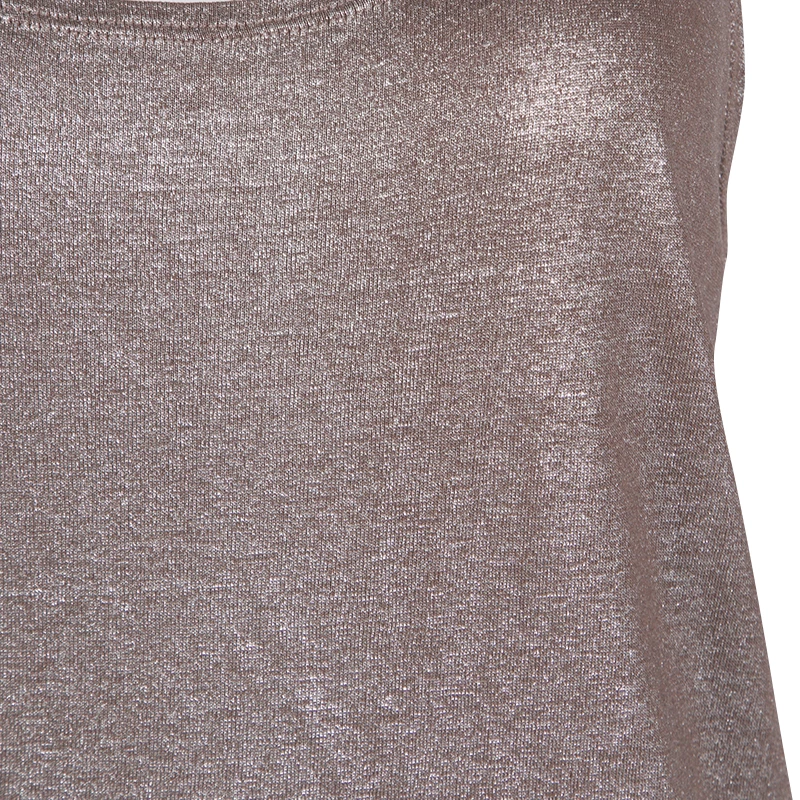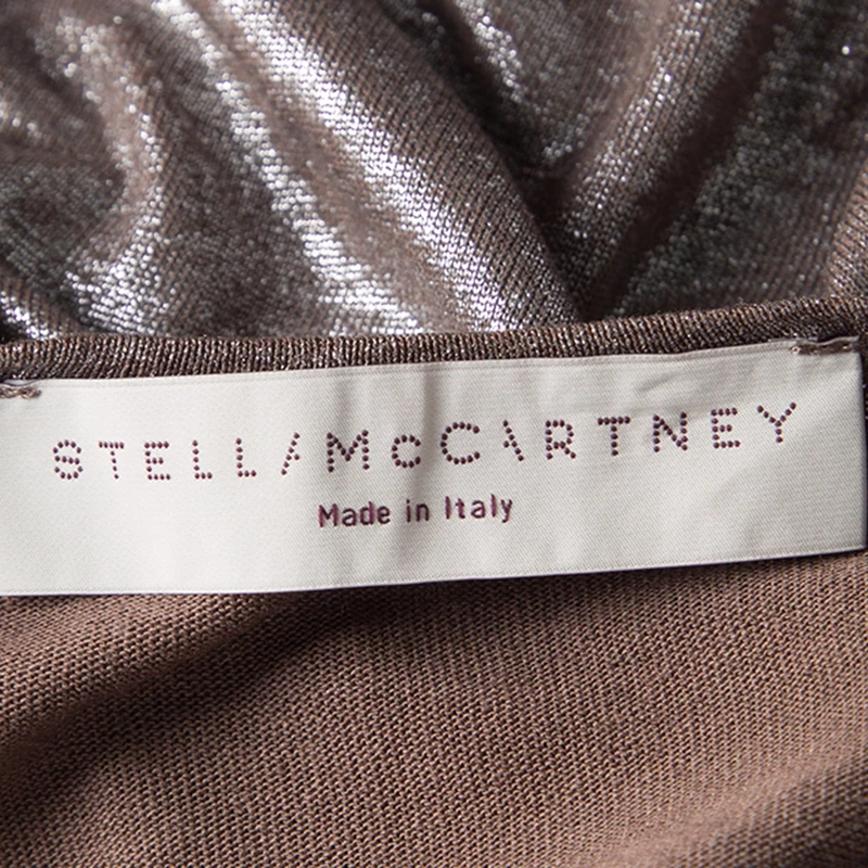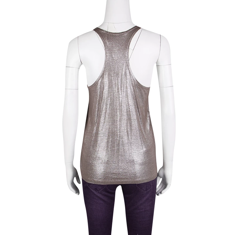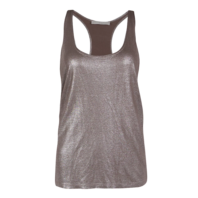 Impress your partner on a dinner date with this classic tank top by Stella McCartney. It is a plain shimmering top with a low neckline in the front and a racer back pattern on the backside offering a loose comfortable fit to your body. Wear yours alone with skinny jeans or layer under a classic cardigan for tactile allure.