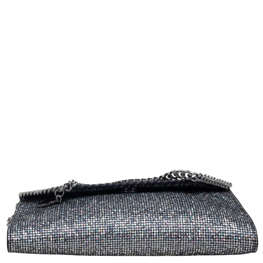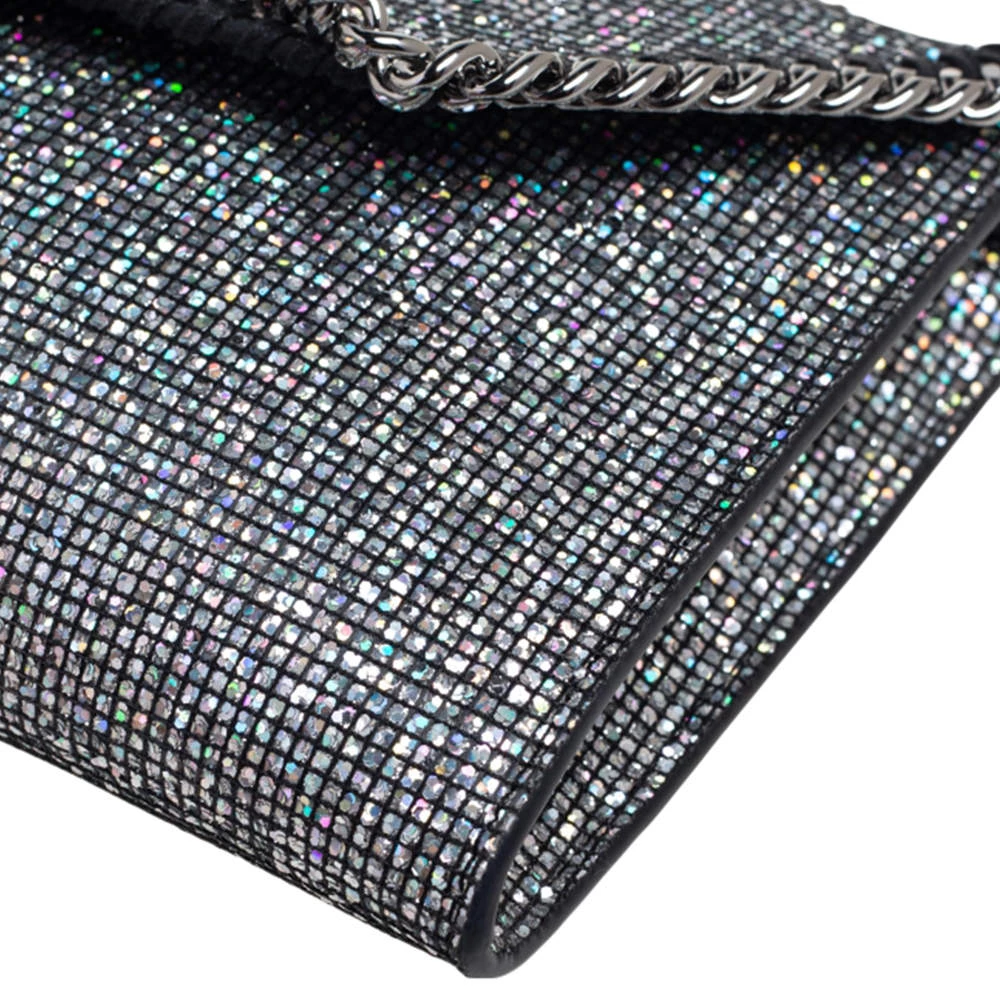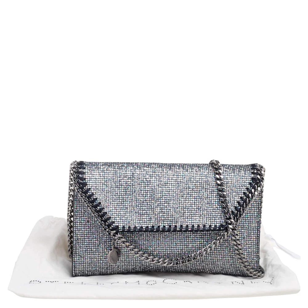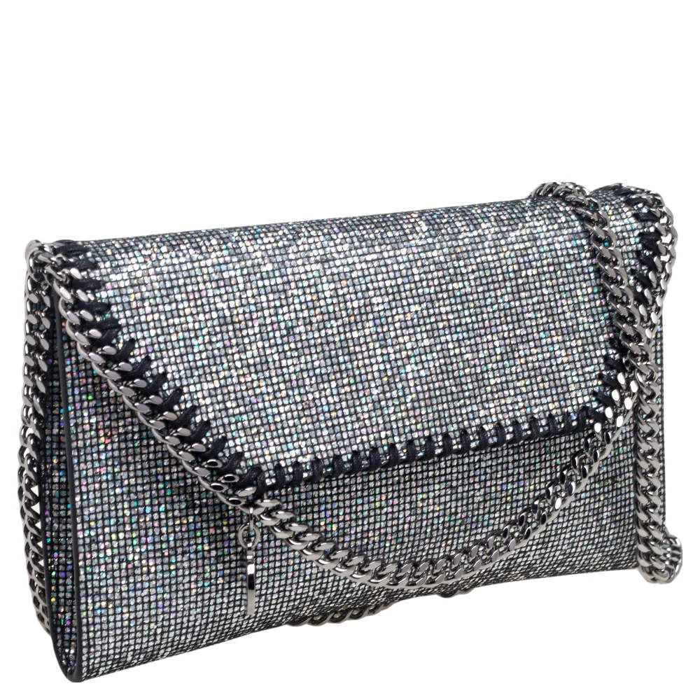 This Falabella crossbody bag from Stella McCartney is finely crafted from metallic disco glitter and styled with a front flap that has silver-tone metal chain stitch detailing. Its nylon interior offers enough space to hold your daily essentials and it is held by a chain-link shoulder sling.