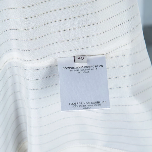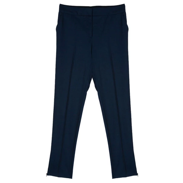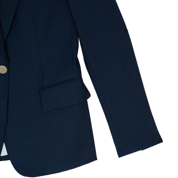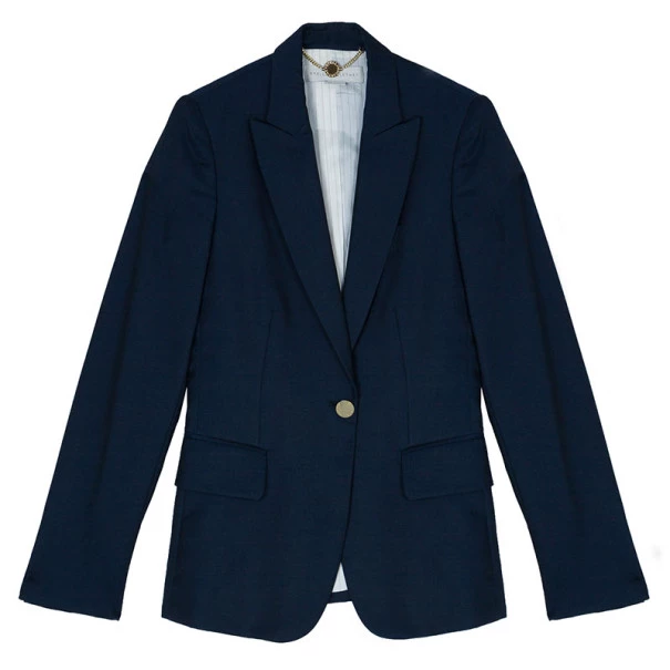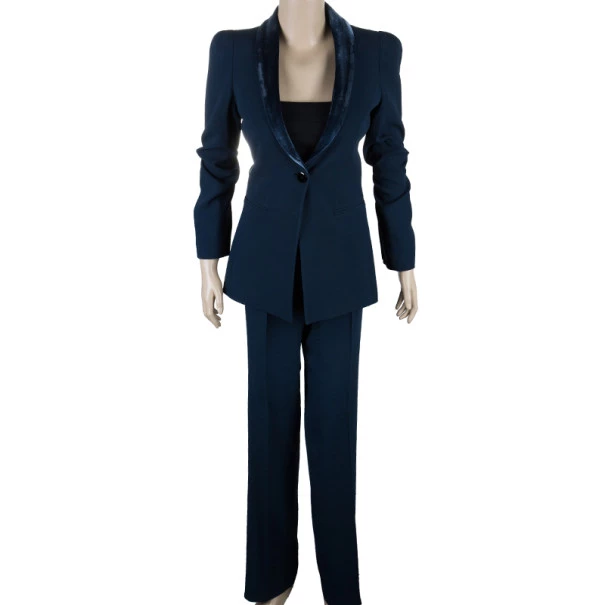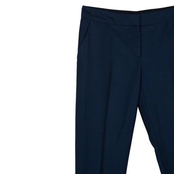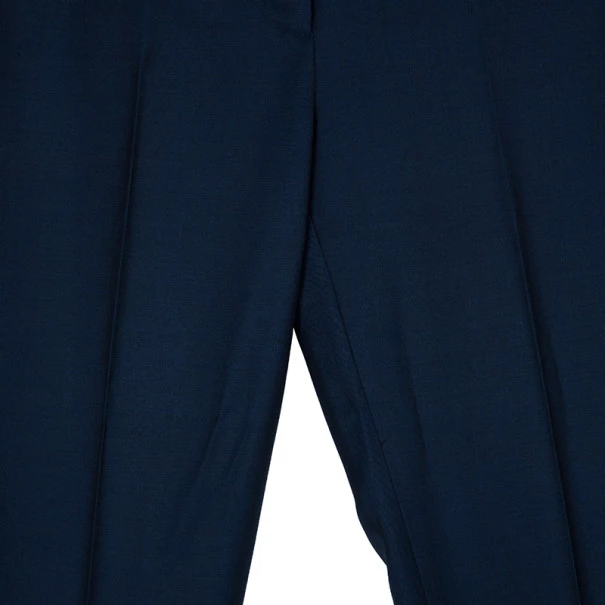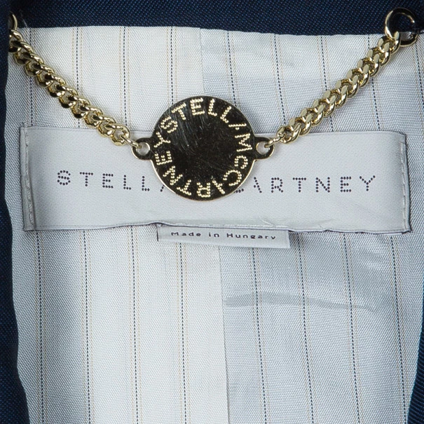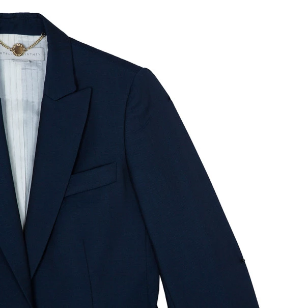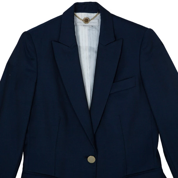 Look sharp in this classy Stella McCartney Suit. Crafted from a wool and mohair blend, this suit features a long sleeves jacket and trousers. Its navy blue jacket has a lapel collar, single button closure, front slip pockets and long sleeves. Its matching trousers feature a straight cut with zipper and clasp closure.