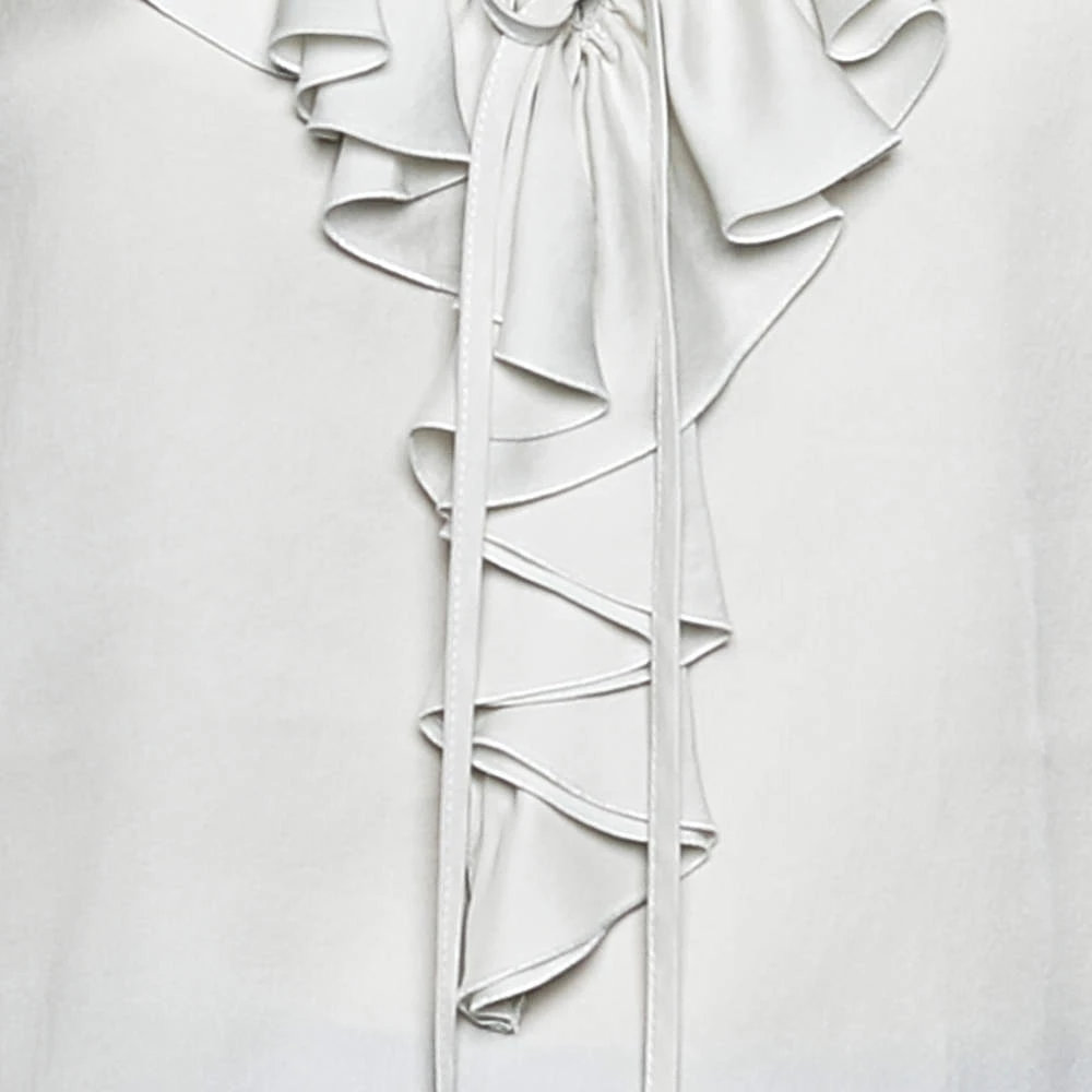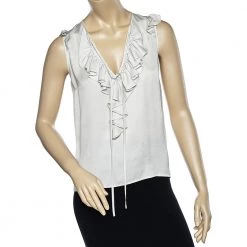 This top from Stella McCartney will outline your style with never-ending femininity and chic aesthetic. It is tailored using off-white silk satin and flaunts a ruffled detailing, a V-shaped neckline, and a sleeveless style. Match this top with black pants to achieve an elegant look.